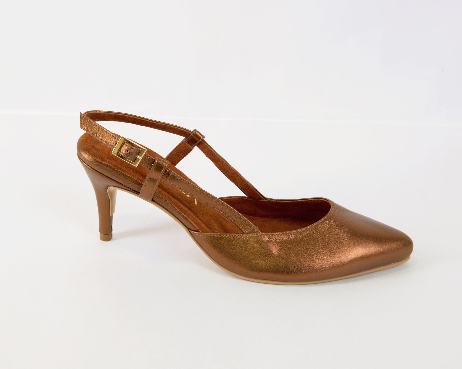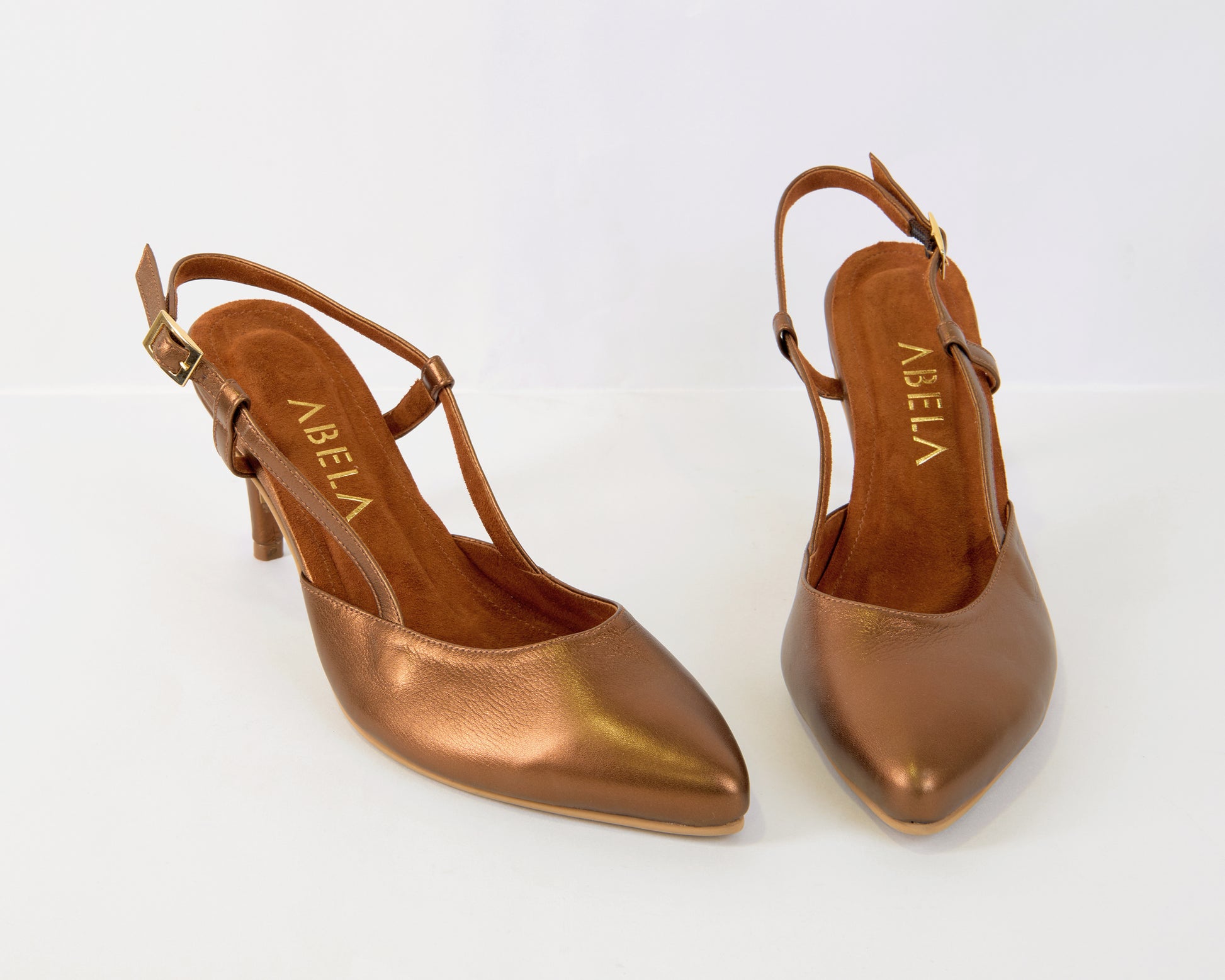 Cross-cut sandals with crossed straps for support. Made of nude leather and semi-square heel.