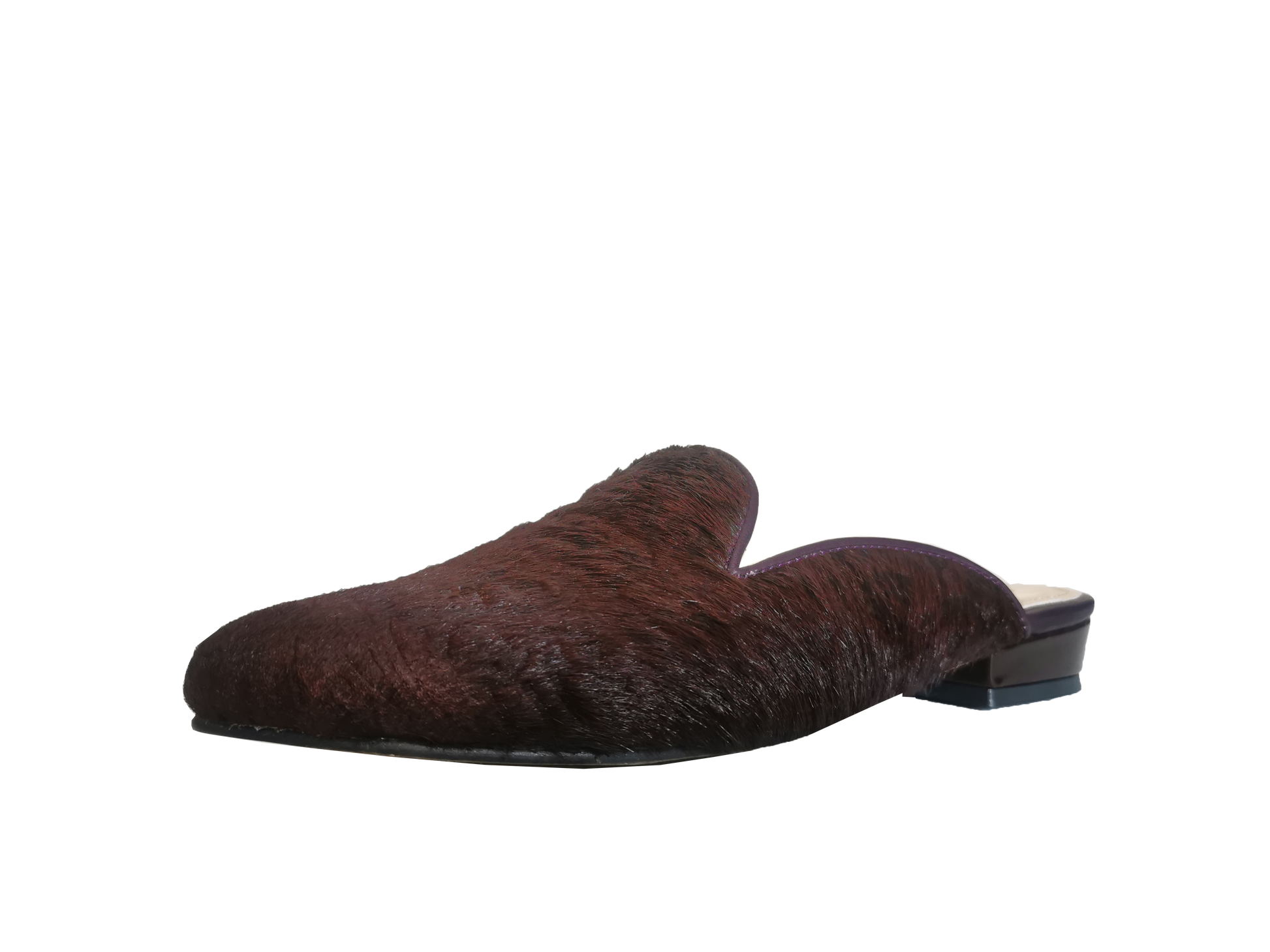 Con un tacón de 1.5cm y destalonadas, nuestros zapatos Ajedrez, están elaborados en cuero de pelo natural color vino.