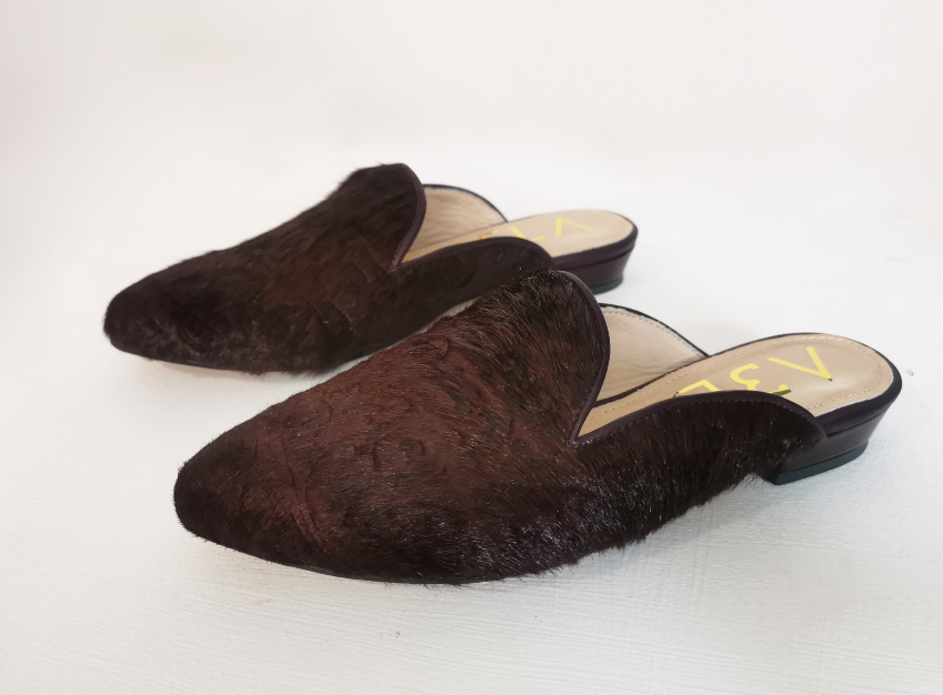Con un tacón de 1.5cm y destalonadas, nuestros zapatos Ajedrez, están elaborados en cuero de pelo natural color vino.