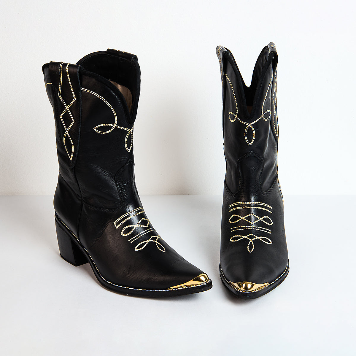 Nuestras texanas están elaboradas en cuero negro, bordado beige y con tacón cuadrado de 5.5cm.