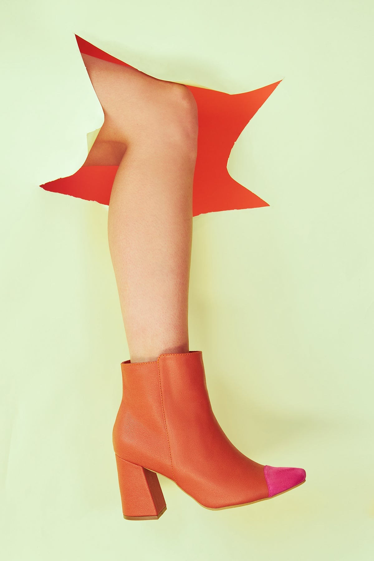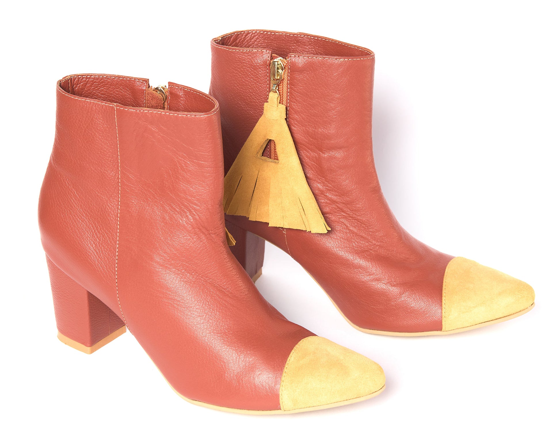 Nuestros botines alfas te empoderan con cada paso. En cuero terracota combinados con gamuza mostaza, serán los protagonista de nuevo look. Elaborados de la mano de artesanos de oficio, tienen punta alargada, cremallera lateral interna, y un tacón cuadrado hiper cómodo de 7.5cm de altura.