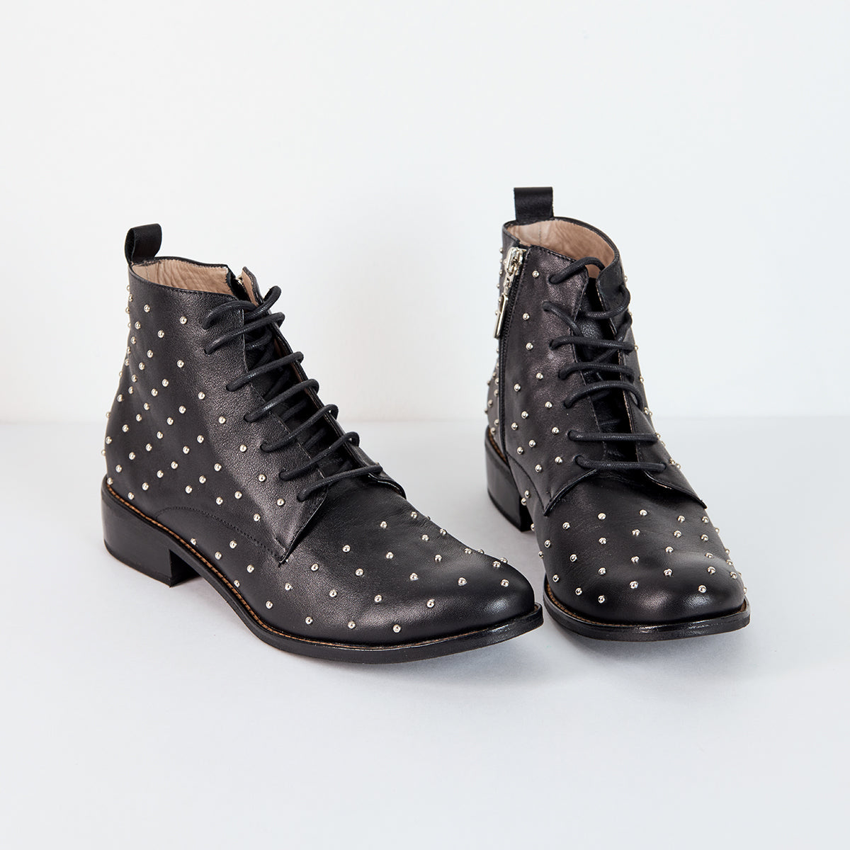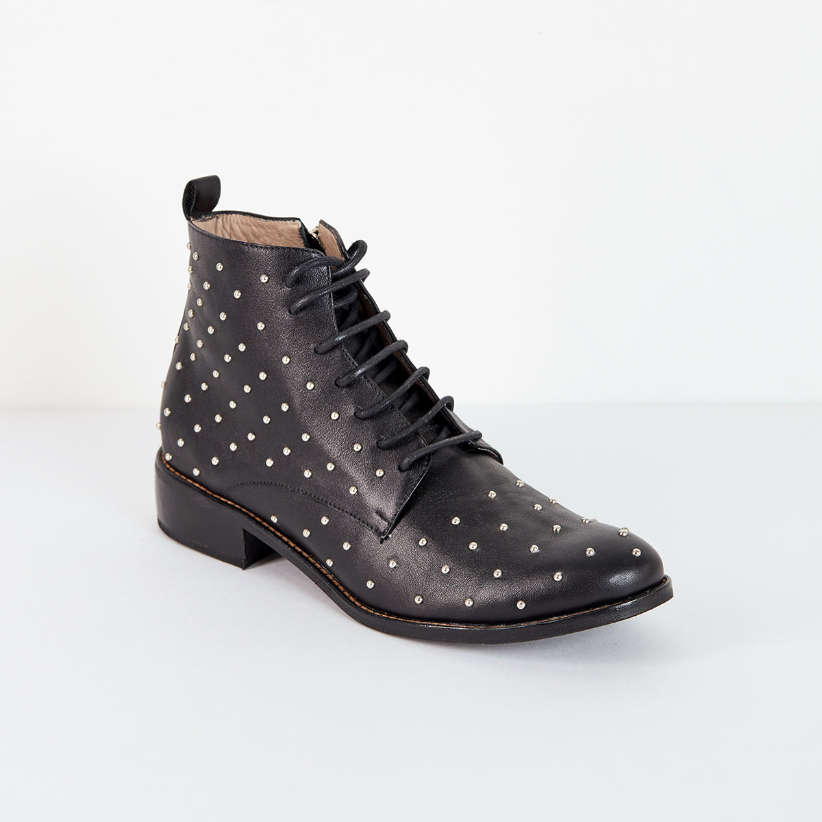 Botines en cuero negro con taches, cordones y punta redonda