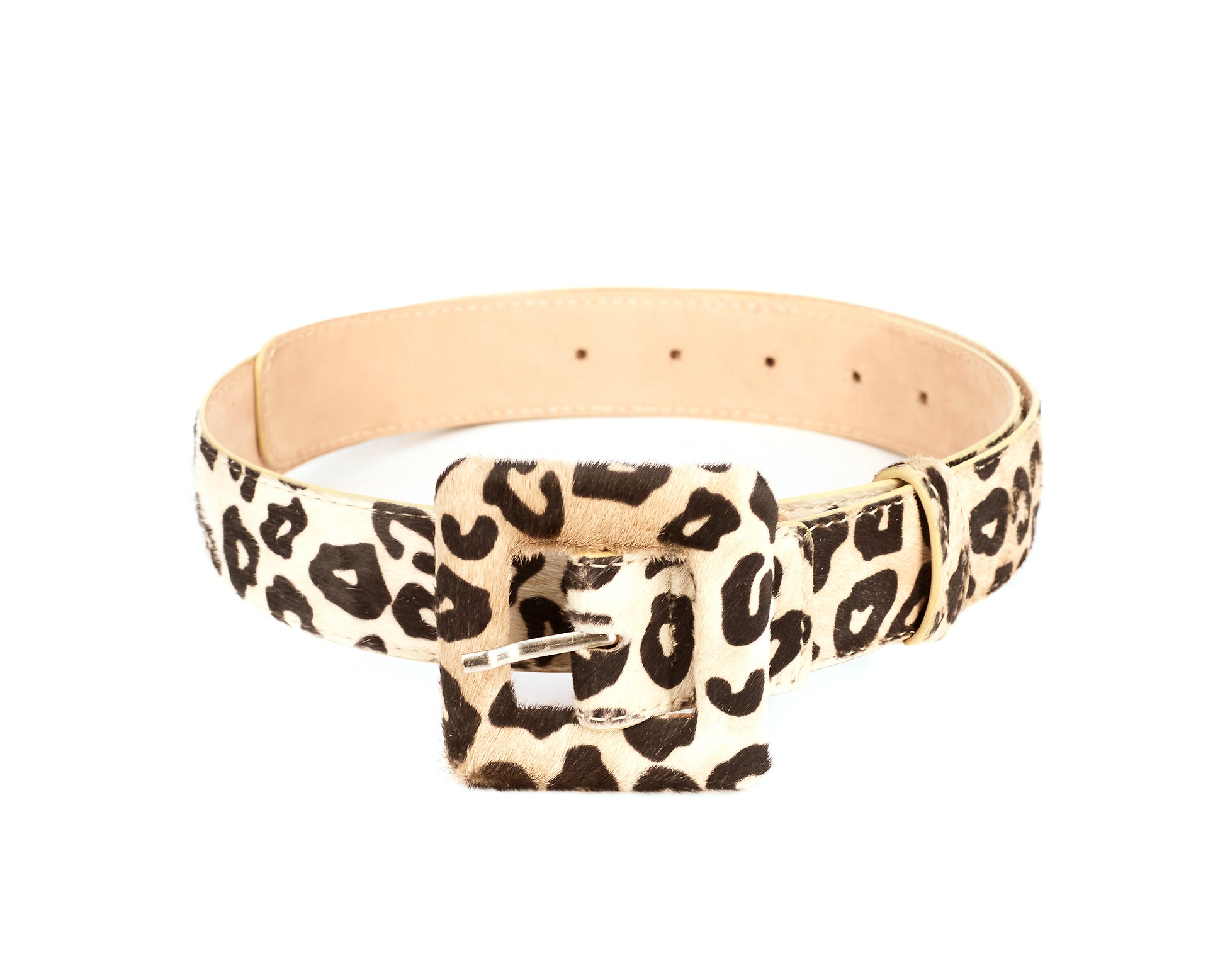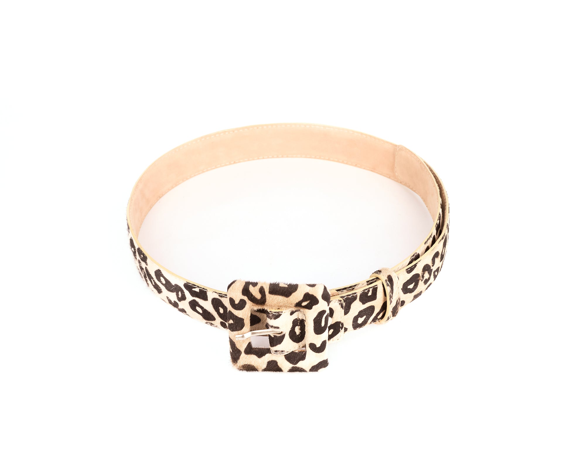 Cinturón elaborado en cuero de pelo natural con animal print. Hebilla cuadrada formado en mismo material.