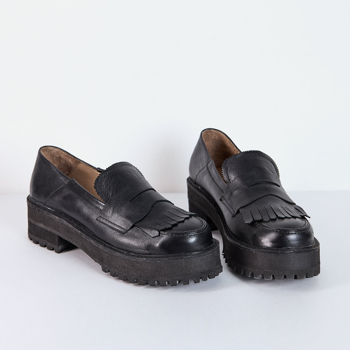 Loafers, o mocasines, elaborados en cuero negro, con flecos clásicos en la capellada y suela tipo chunky para ganar 4cm extra de estatura.