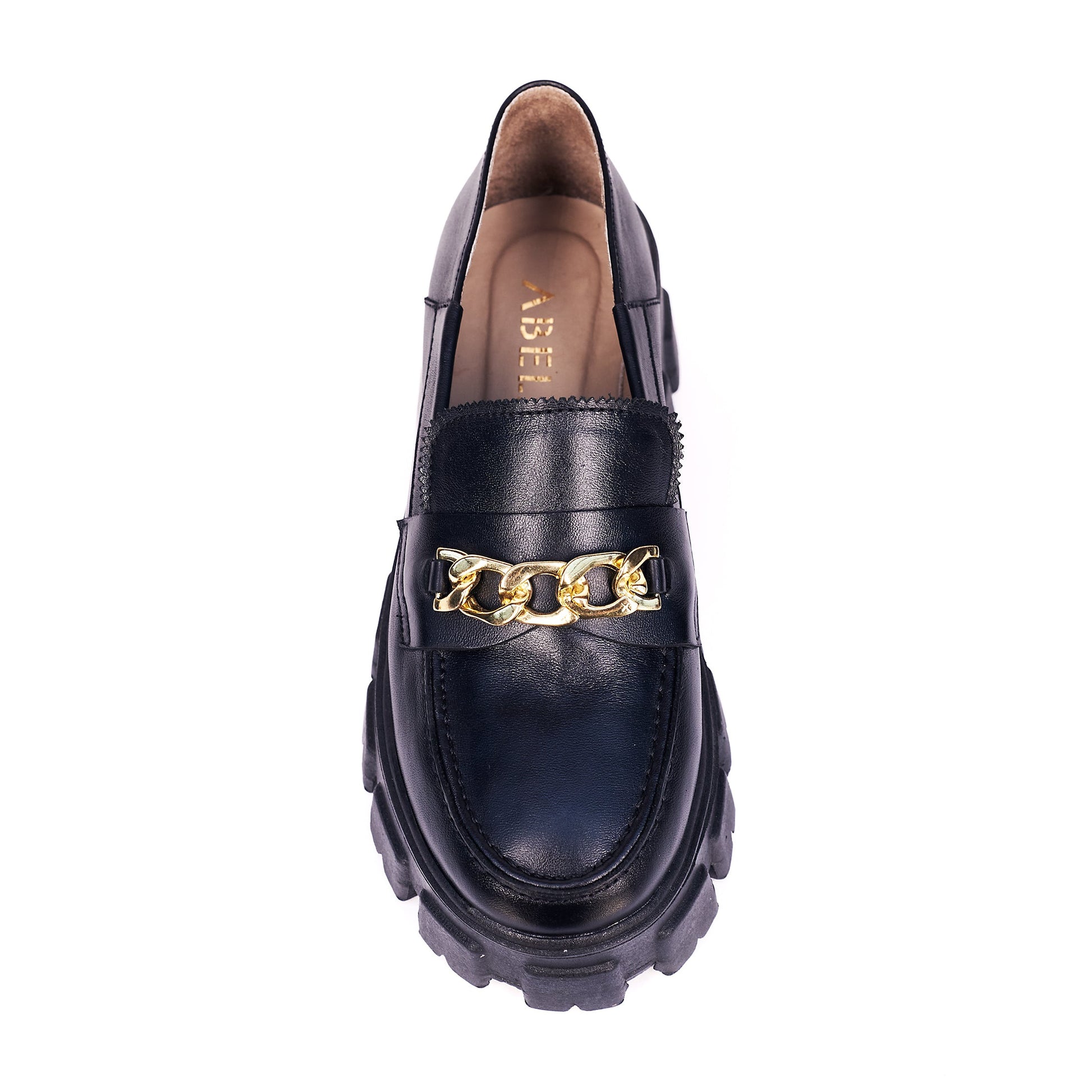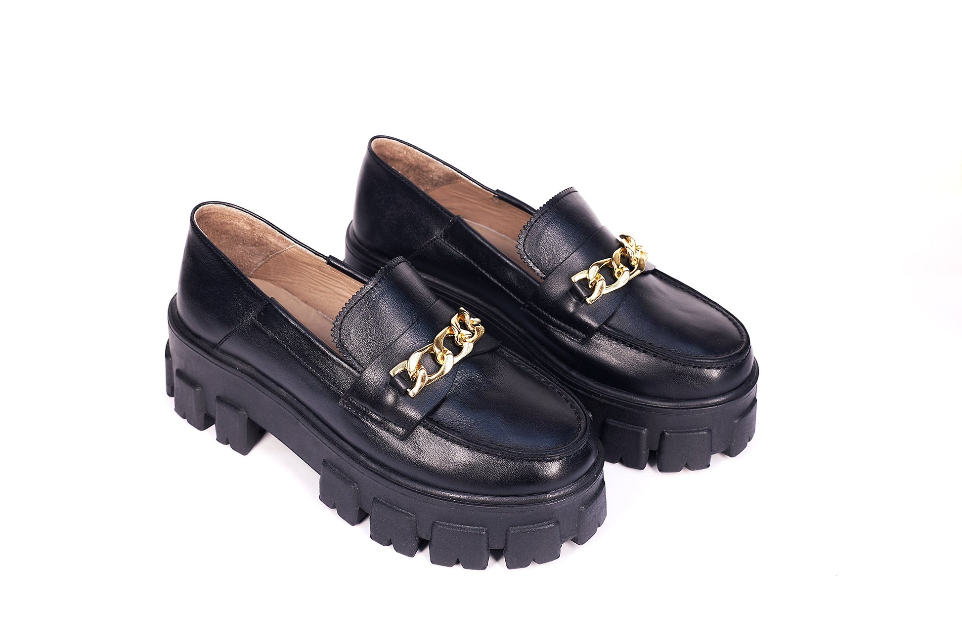 Mocasines (loafers) elaborados en cuero negro con herraje tipo cadena en la capellada. ysuela chunky de 5cm.
