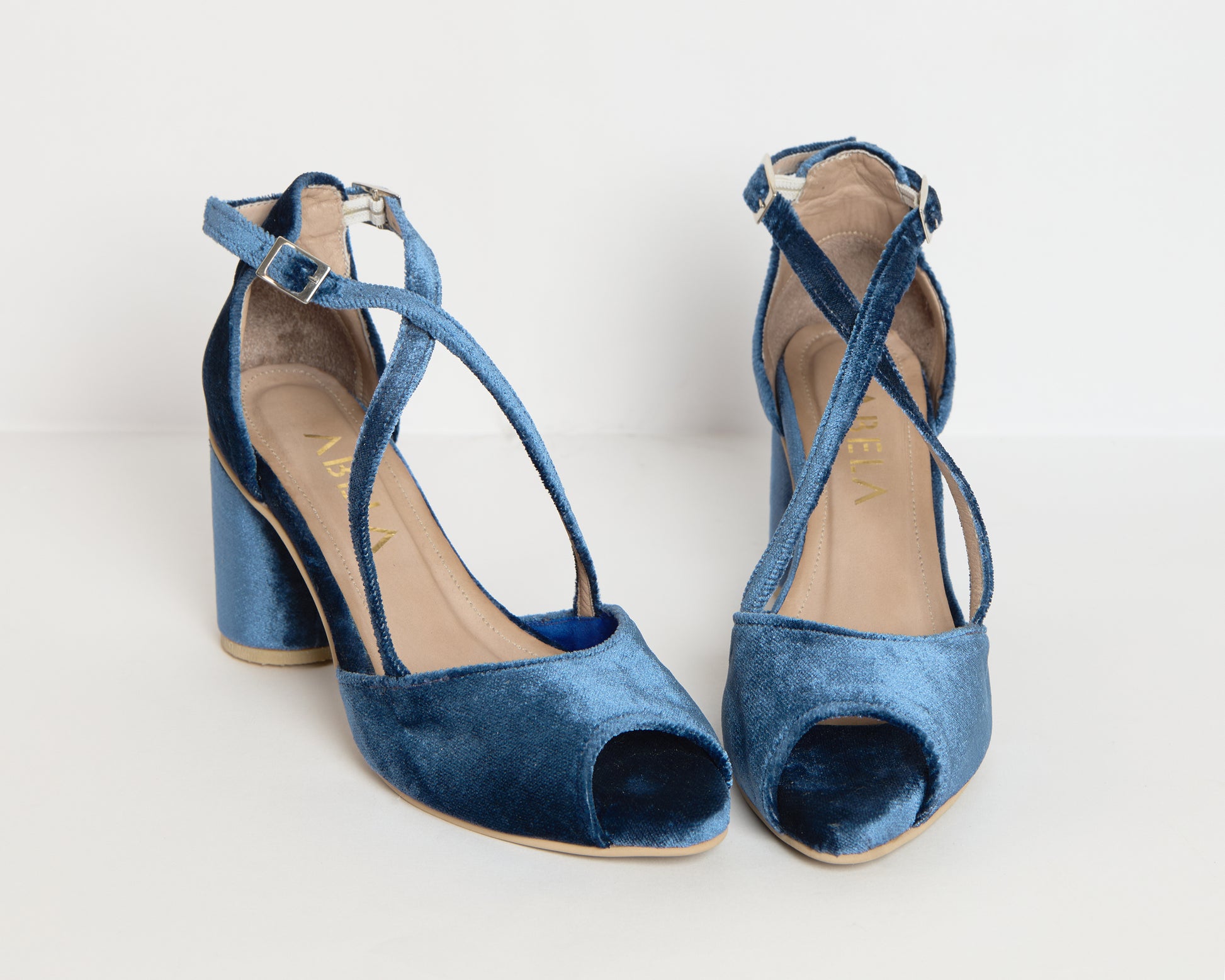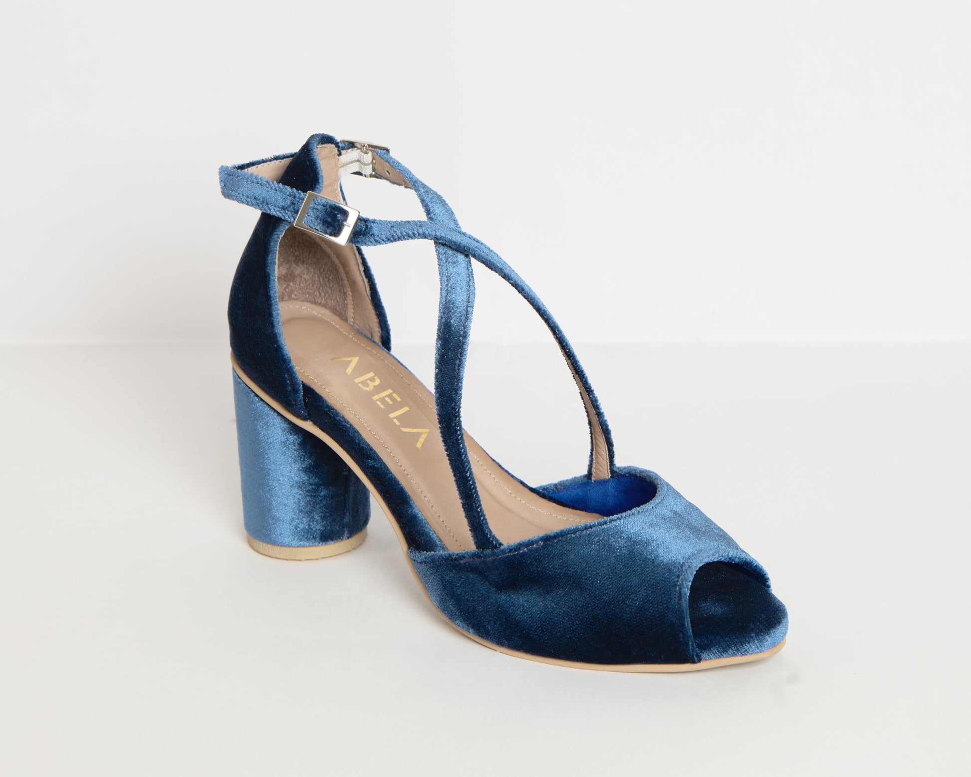 Sandalias elaboradas en terciopelo azul con plataforma interna de 0.5cm y tacón cilíndrico medido por detrás de 6.5cm . Cuenta con correas cruzadas que dan apoyo en el empeine.