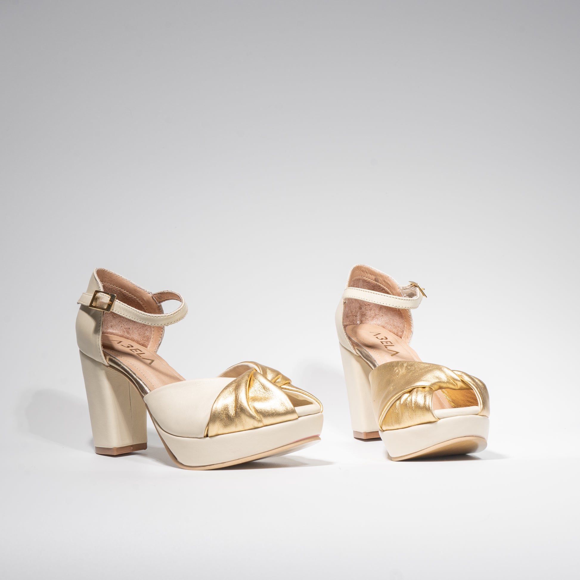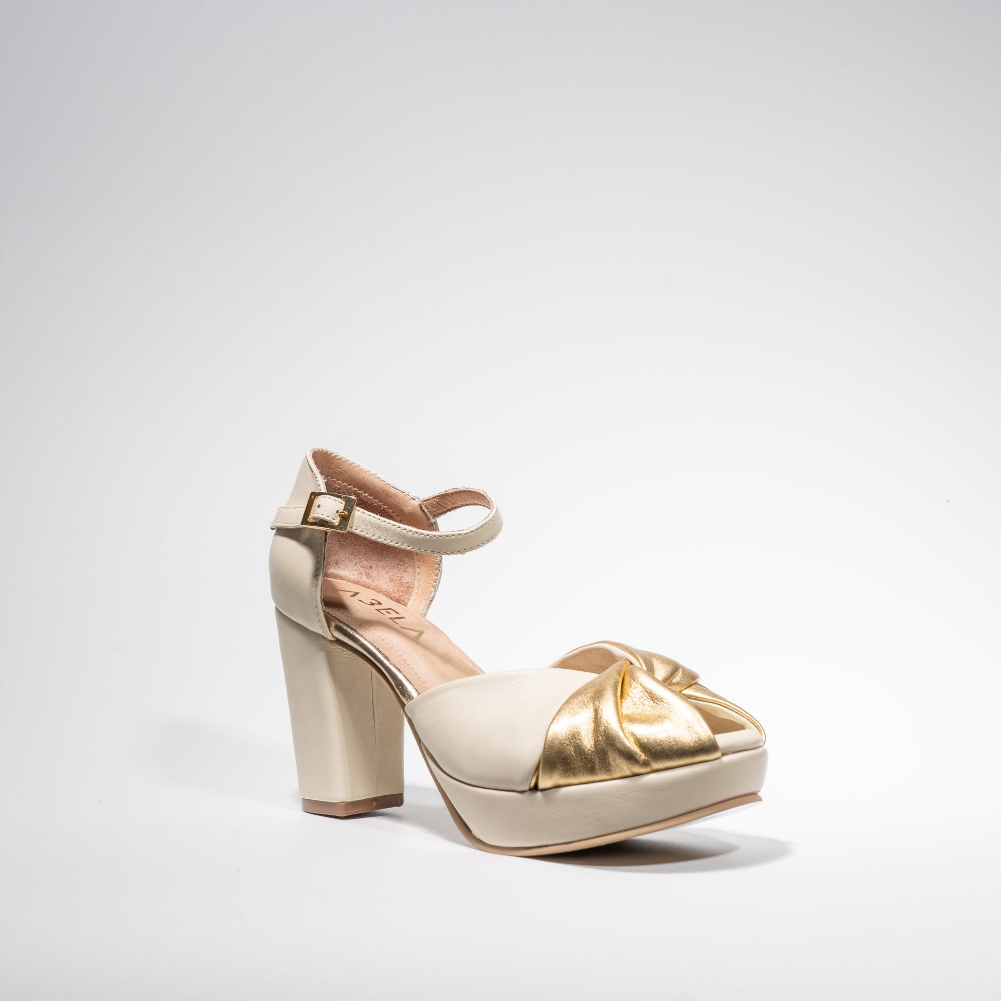 Sandalias elaboradas en cuero blanco con combinación de cuero de confección dorado, con trabilla en el empeine para brindar apoyo. Elaboradas en un cuero tipo napa, super suave para disfrutar de su comodidad.