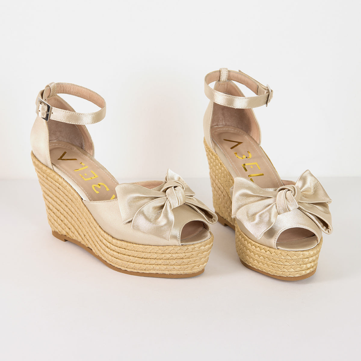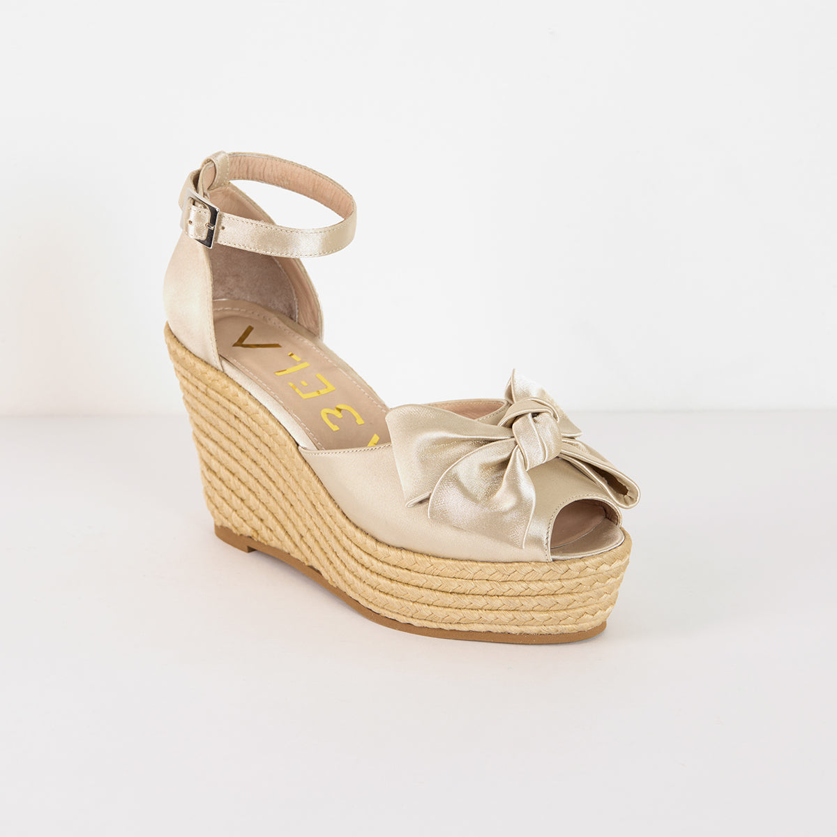 Las sandalias de tacon corrido son la elección perfecta para eventos playeros en donde requieres estabilidad. Con una combinación en yute natural y satin perla, nuestras sandalias con moño XL te darán ese estilo femenino que estabas buscando para complementar tu hermoso vestido.