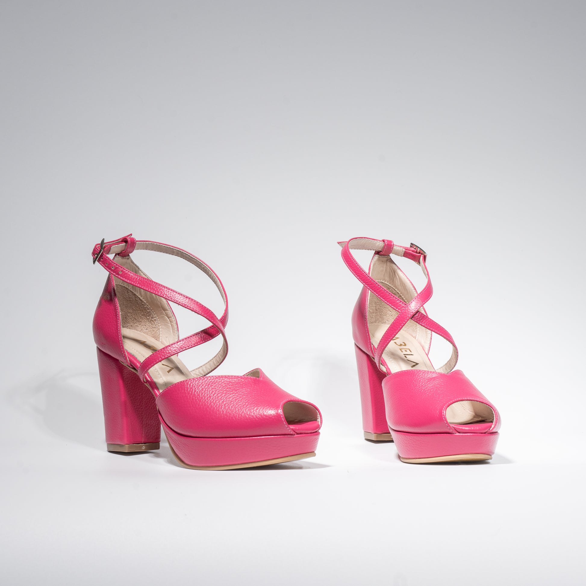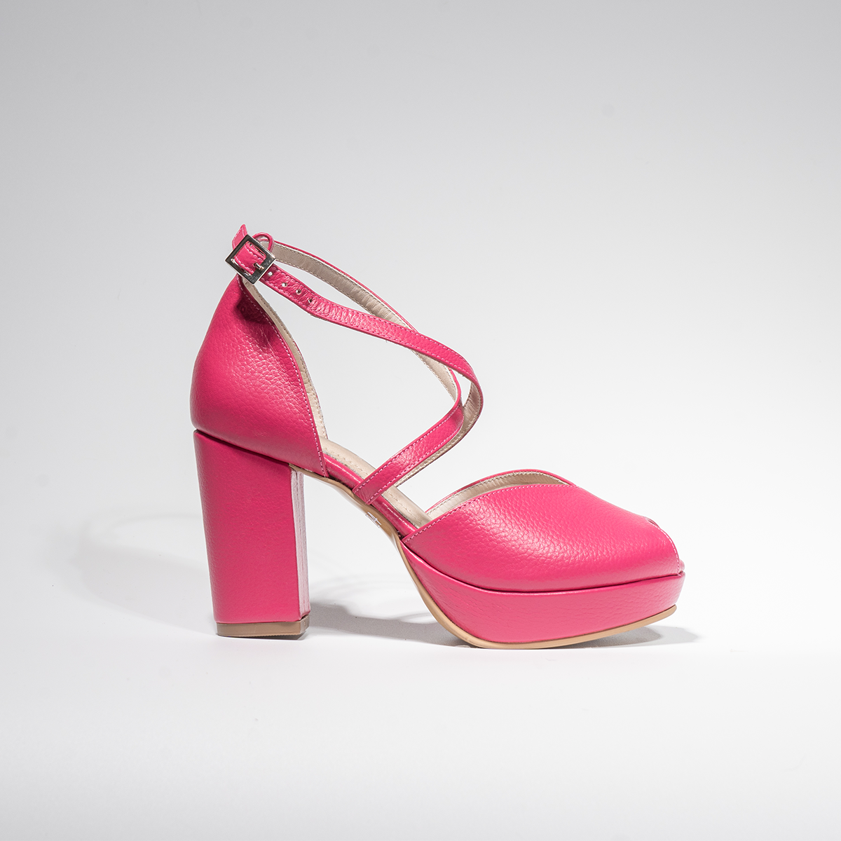 Nuestra versión más querida por nuestras clientas. Sandalias con punta semiabierta, capellada en V y trabillas cruzadas que brindan estabilidad para bailar toda la noche. Elaboradas en cuero Fucsia, con tacón de 11cm, plataforma de 2cm visible y tacón cuadrado.