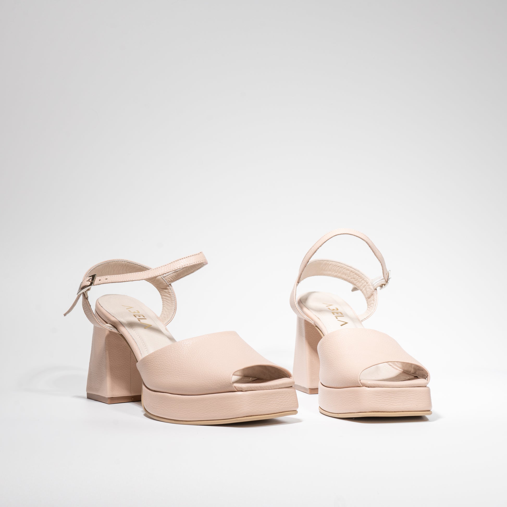 Nuestras Sandalias Emma de punta cuadrada están elaborados en cuero Nude, cuentan con una plataforma de 2cm y correa al empeine. El tacón super cuadrado tiene un altura de 9cm medido por detrás.