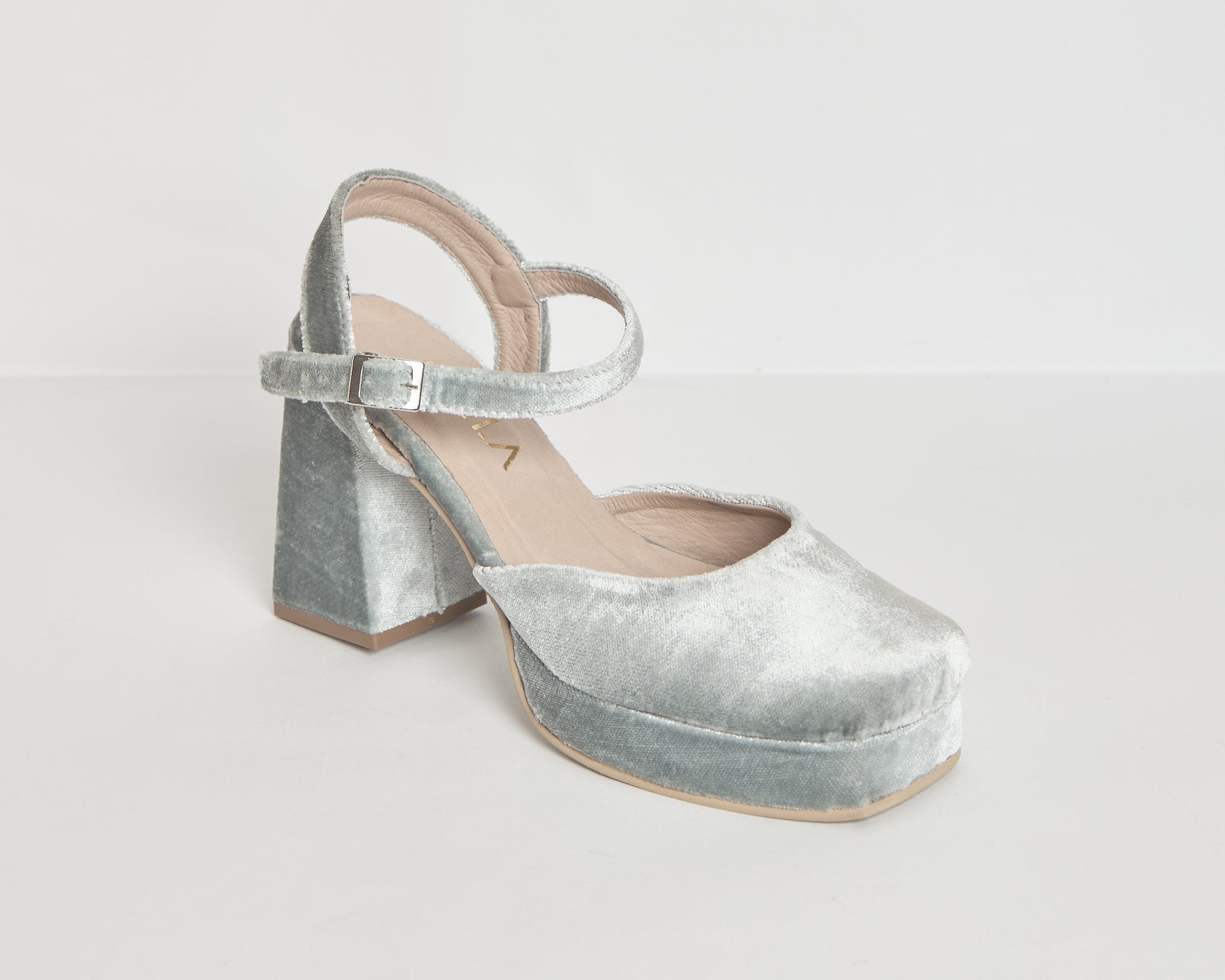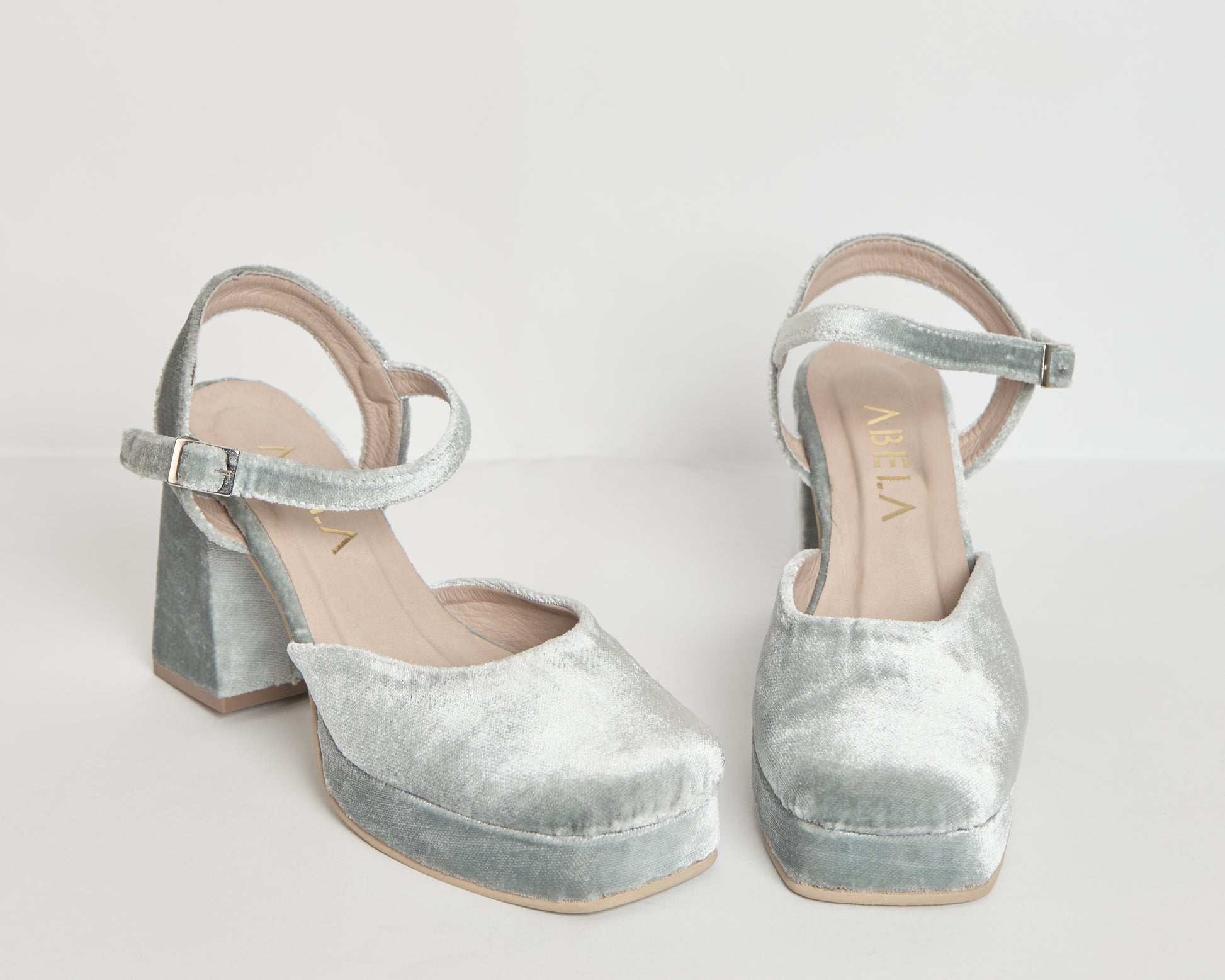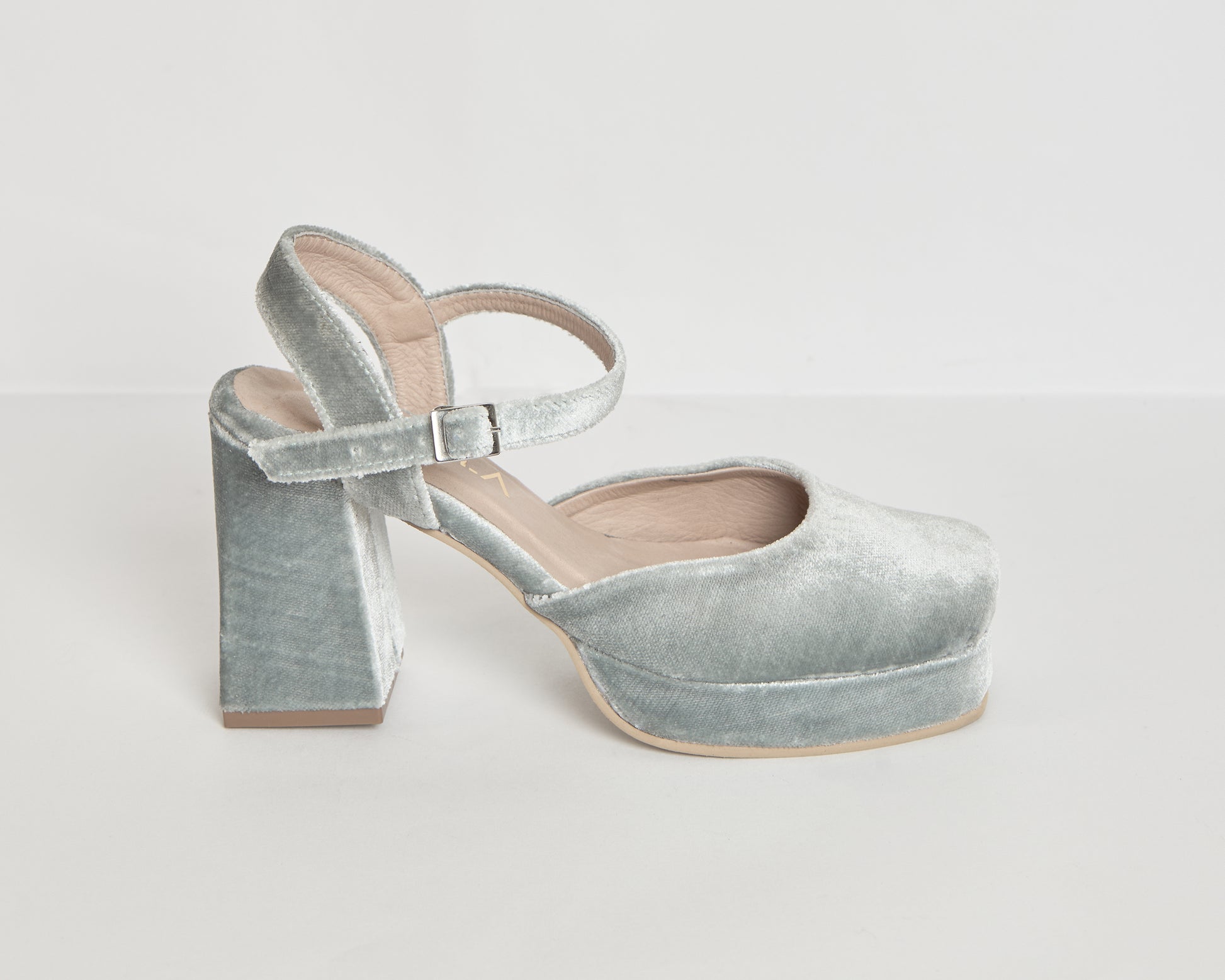 Tacones de punta cuadrada elaborados en terciopelo verde menta, cuentan con una plataforma de 2cm y correa al empeine. El tacón super cuadrado tiene un altura de 9cm medido por detrás.