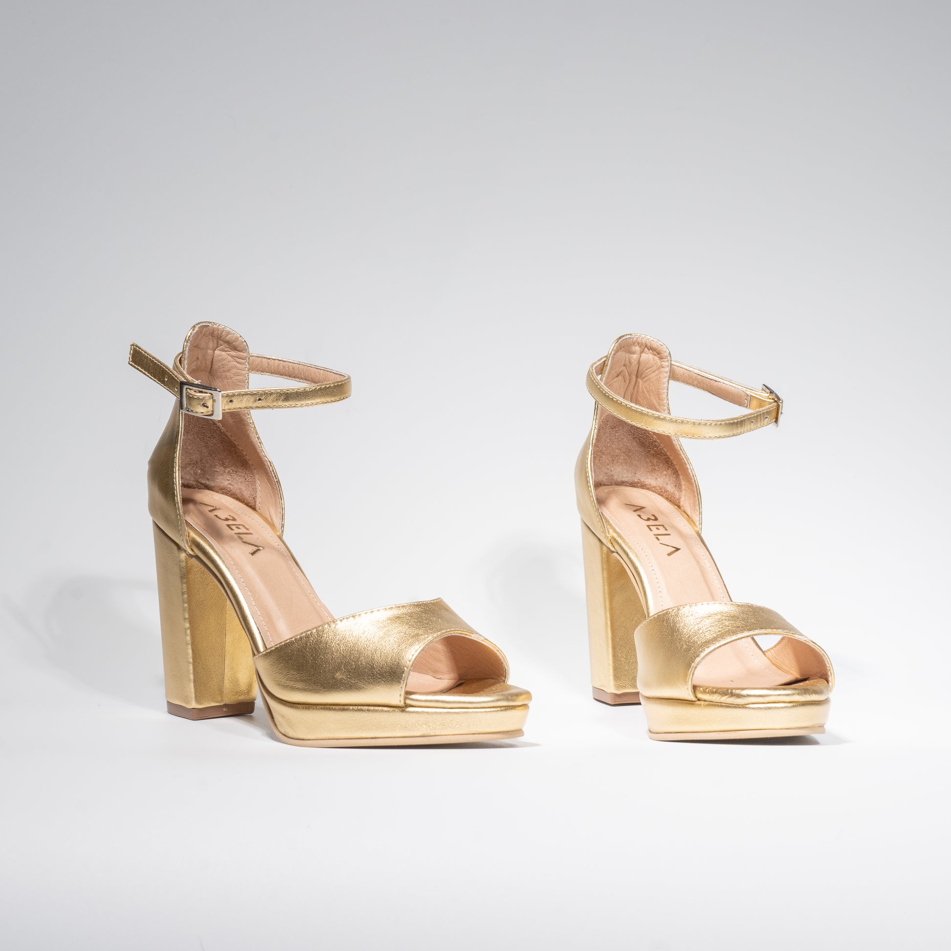 Sandalias elaboradas en cuero dorado, con plataforma visible de 1cm, tacón cuadrado y correa al tobillo.