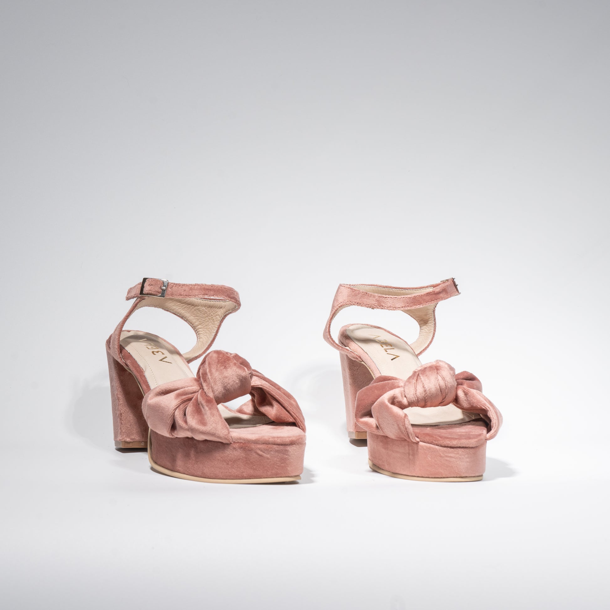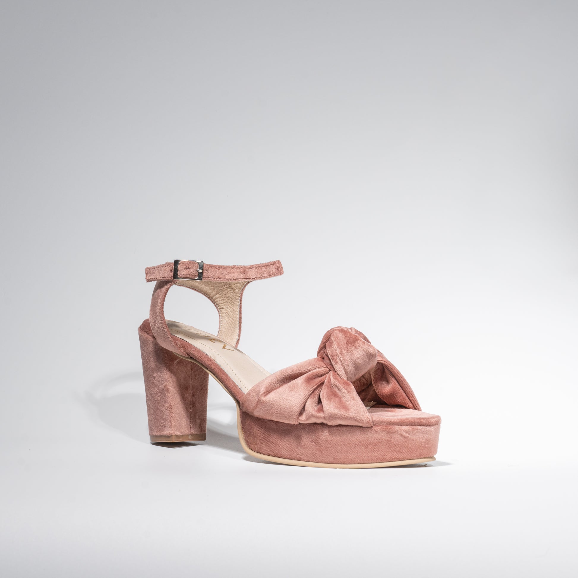 Sandalias elaboradas en terciopelo Chocolate, con tacón cuadrado medida por detrás de 9cm, con plataforma y correa para ajustar al empeine.