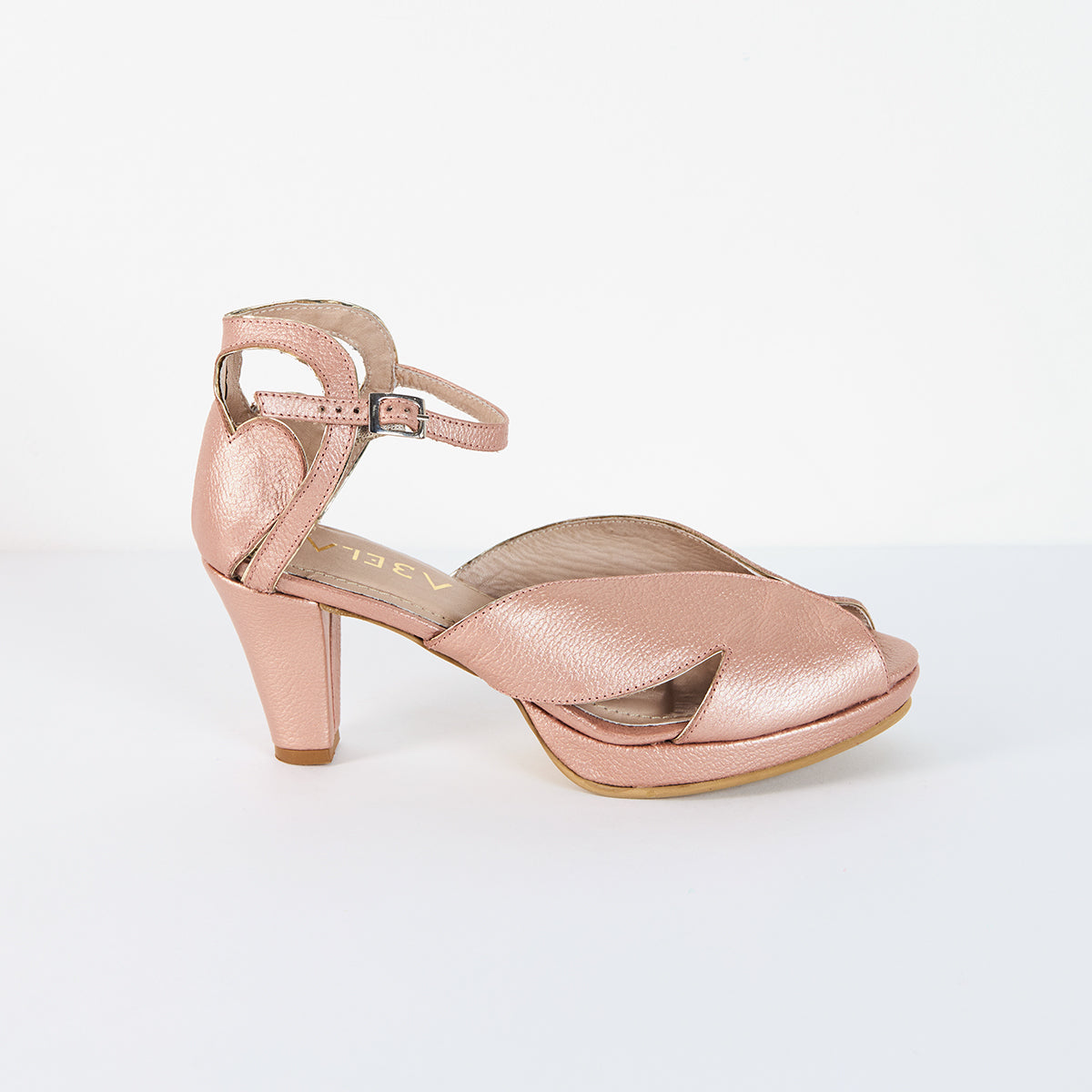Elaboradas en cuero oro rosa, con plataforma de 1cm y tacón cónico.
