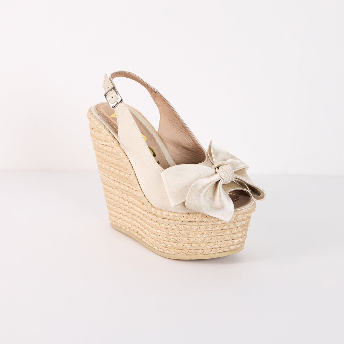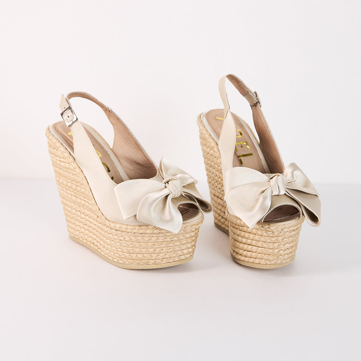 Sandalias destalonadas de tacon corrido, forrado en yute de fibra natural, y elaboradas en satin perla con un moño que adorna la punta. El tacón mide 13cm por detrás.