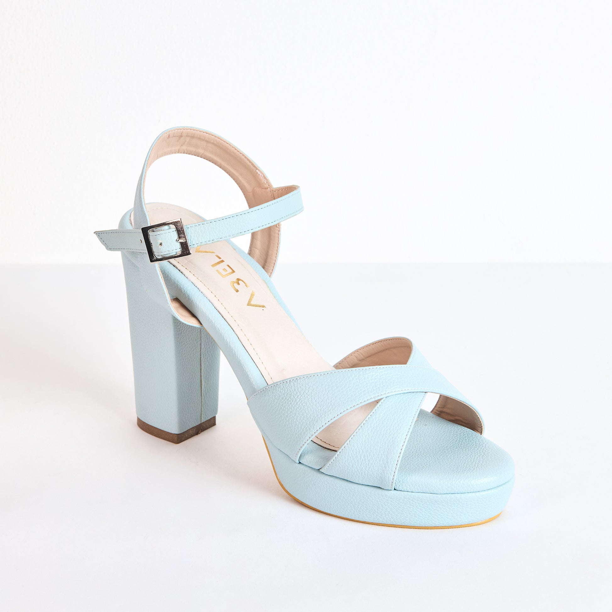 Sandalias elaboradas en textil azul bebe, con capellada cruzada decreciente, tacón cónico medido por detrás de 11cm, plataforma de 2cm visible y talon descubierto con trabilla al empeine para brindar mayor comodidad.