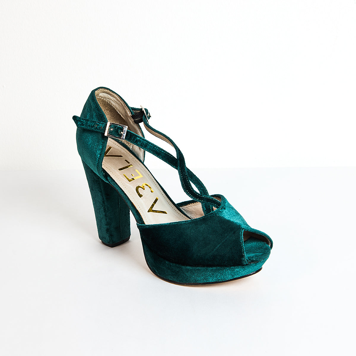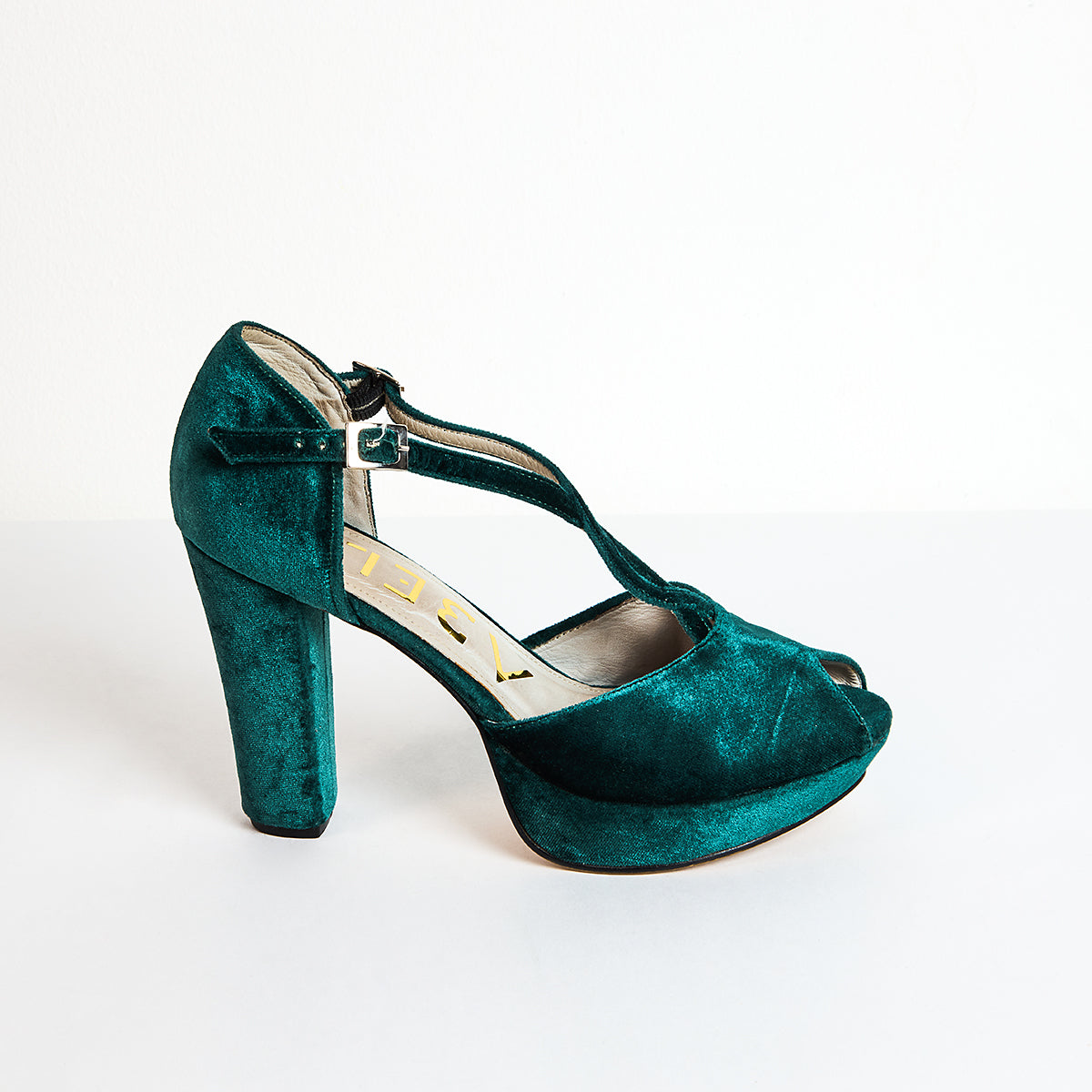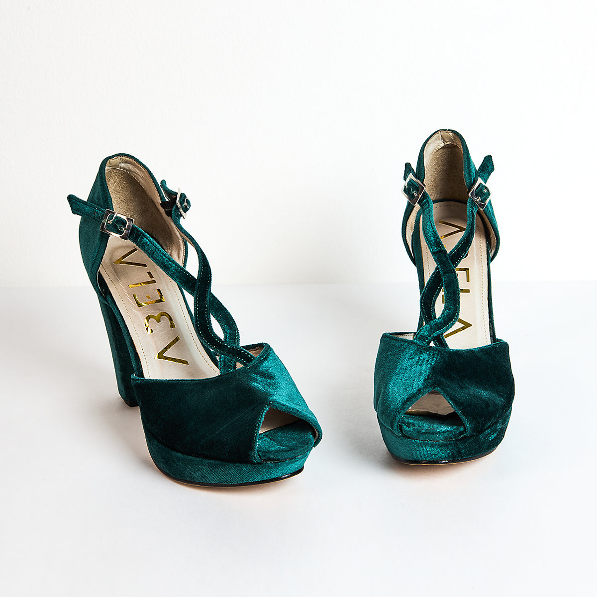 Sandalias de punta semiabierta elaborados en terciopelo verde esmeralda, con plataforma de 2cm y tacón cuadrado medido por detrás de 11cm