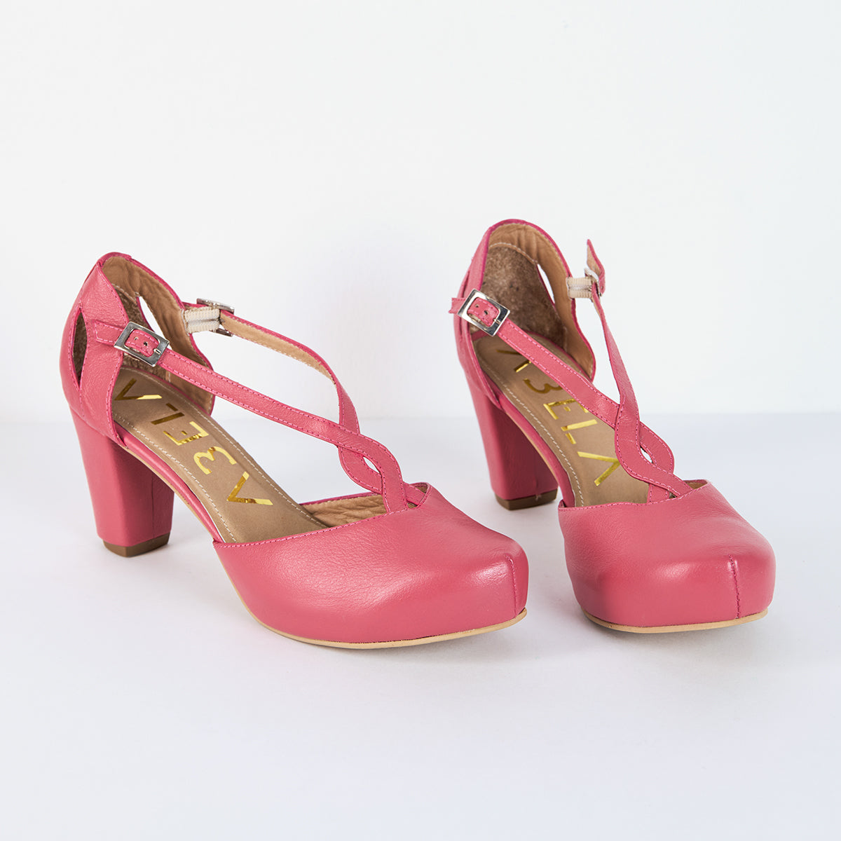 Tacones en cuero rosa, con punta redonda, y plataforma de 1cm escondida. Su tacón semicuadrado es perfecto si has perdido la costumbre de estar en tacones. Sin duda van a hablar de tu personalidad y no pasaran desapercibidos.