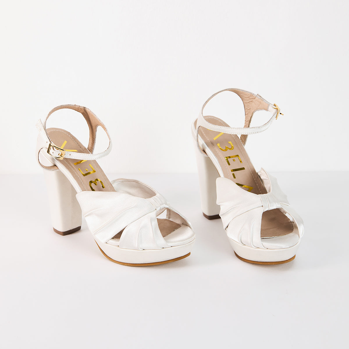 Sandalias elaboradas en satín blanco, con plataforma de 2cm y tacón semicuadrado con altura medida por detrás de 11cm. Cuenta con talón descubierto y trabilla al empeine para mayor apoyo. La capellada tiene un diseño con pliegues y nudo en el centro para adornar los pies.