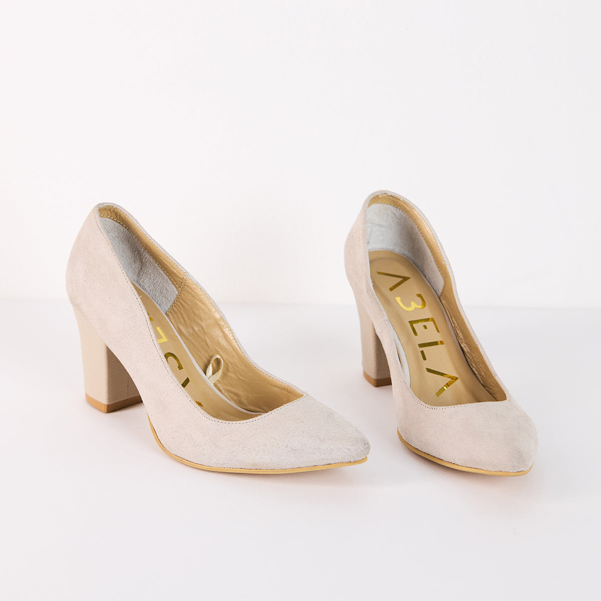 Tacones elaborados en gamuza beige, con tacón en cuero talco. Altura 6.5cm por tacón cuadrado.