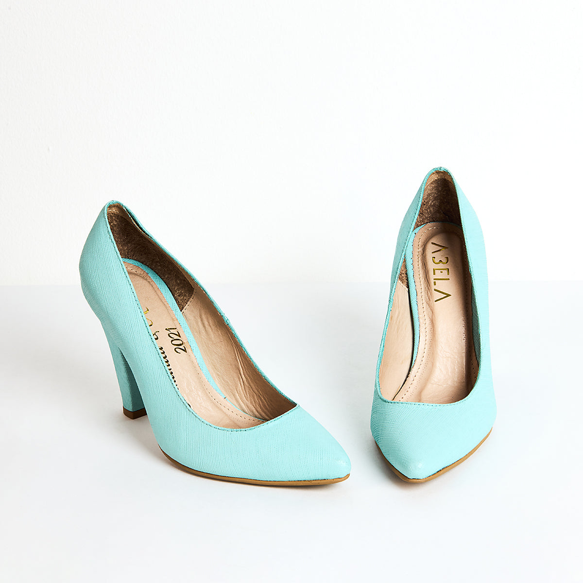 Tacones elaborados en cuero turquesa con textura cuadriculada, altura 8.5cm y tacón cónico.