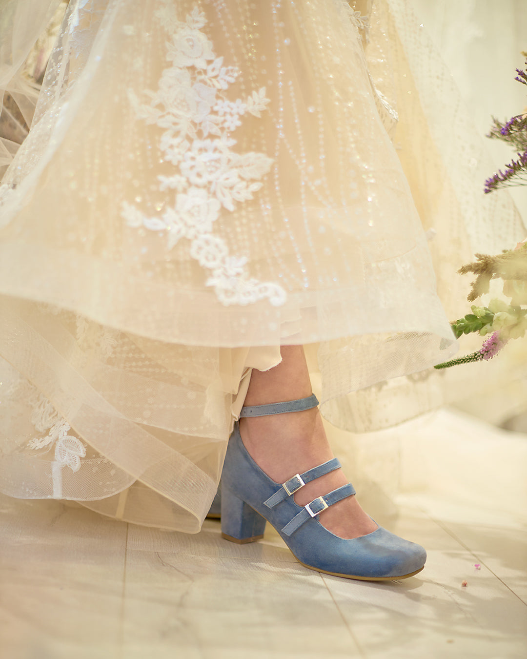 Tacones con punta cuadrada, tacón cuadrado y correas que adornan el empeine y el tobillo. Elegimos un terciopelo azul como materail principal.
