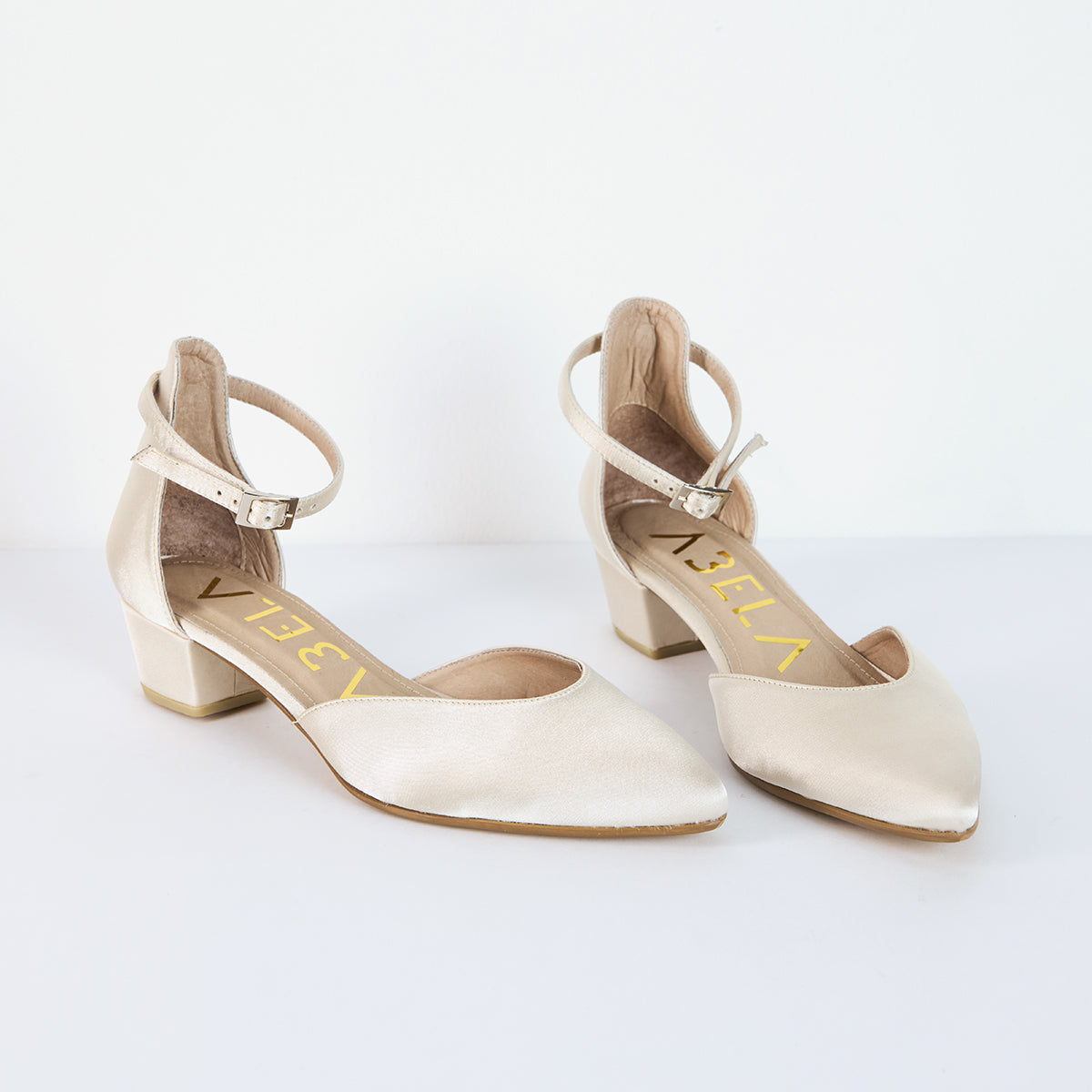 Tacones con un corte doble d'orsay, escotados a los lados, con punta puntuda y tacón cuadrado. Elaborados en satin perla y de altura 3.5cm, puedes usarlos en ocasiones elegantes y sin duda con tus jeans preferidos.