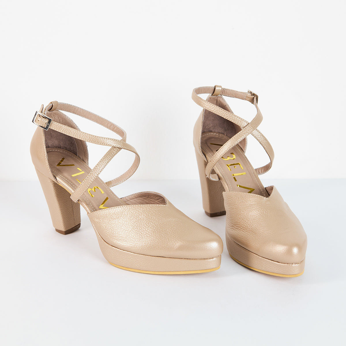 Nuestros best sellers, ahora disponibles con punta almendrada y en cuero champaña dorado. Con la altura preferida por nuestras clientas, su tacón semicuadrado de 9cm y plataforma de 2cm te brindan el estilo y confort que tanto necesitas para bailar toda la noche.
