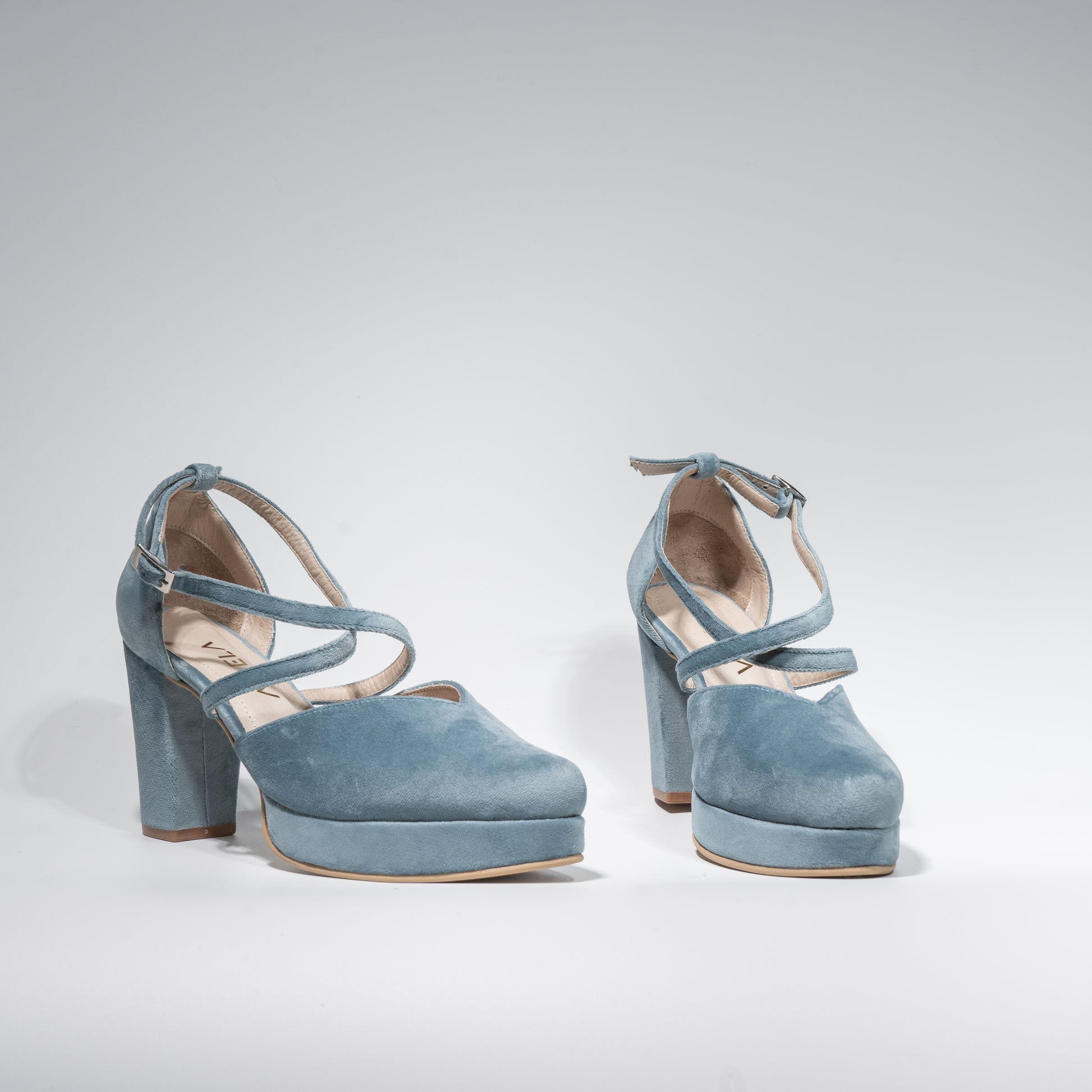 Tacones de punta almendrada, elaborados en terciopelo azul, con correas cruzadas que atraviesan en el empeine, con plataforma de 2cm y tacón cuadrado 7.5cm medido por detrás de 8cm.