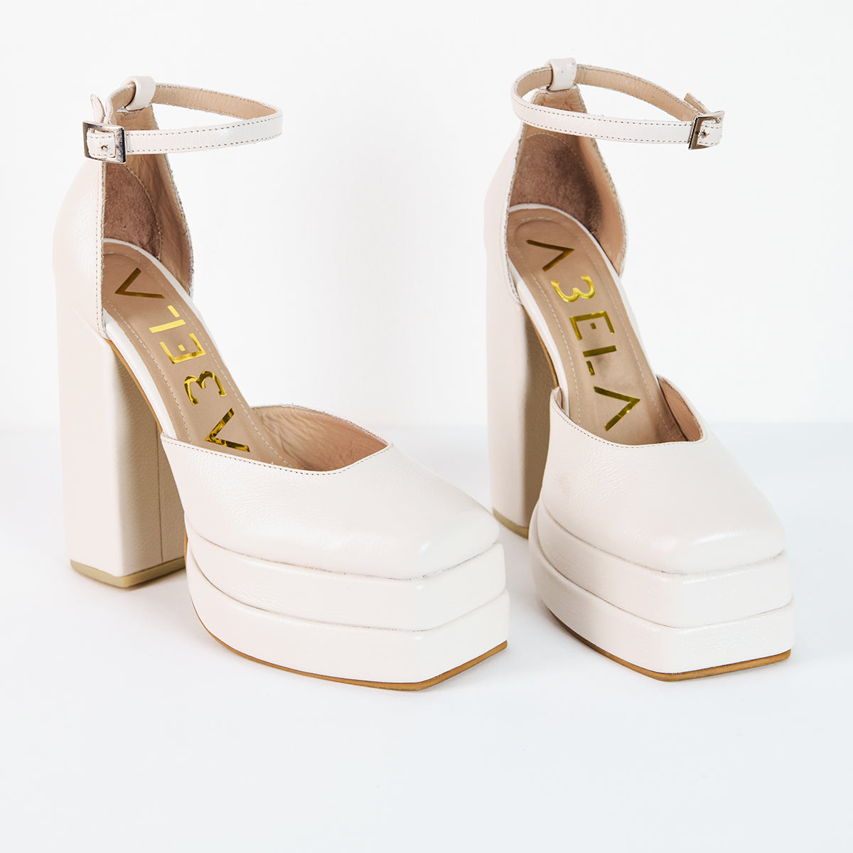 Nuestros tacones Ensueño de punta cuadrada están elaborados en cuero marfil, cuentan con una doble plataforma y correa al tobillo para adornar su tacón super cuadrado.