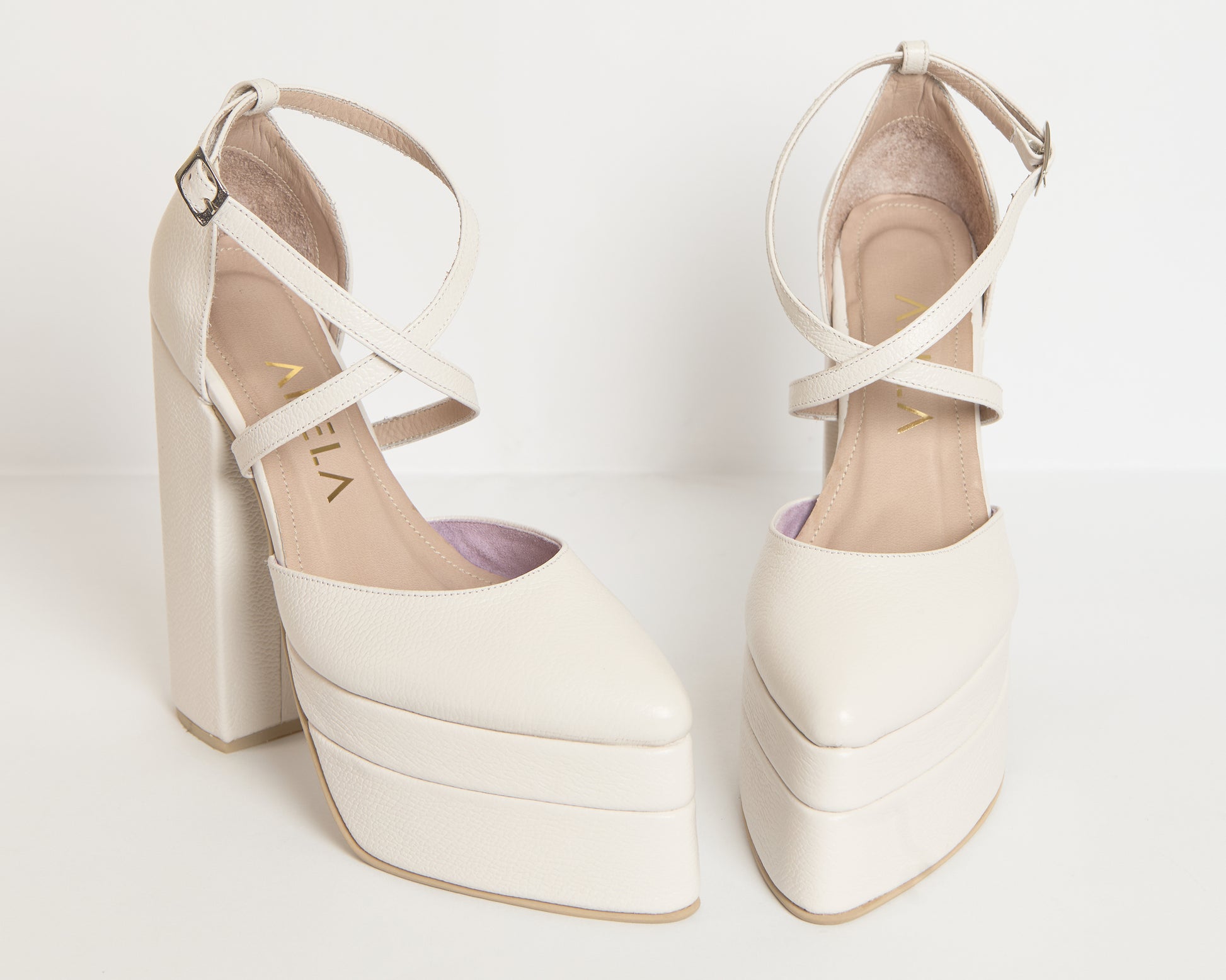 Nuestros tacones Ensueño de punta puntuda están elaborados en cuero marfil, cuentan con una doble plataforma y correa cruzada para adornar y brindar apoyo, así como con un tacón super cuadrado que mide por detrás 14cm.
