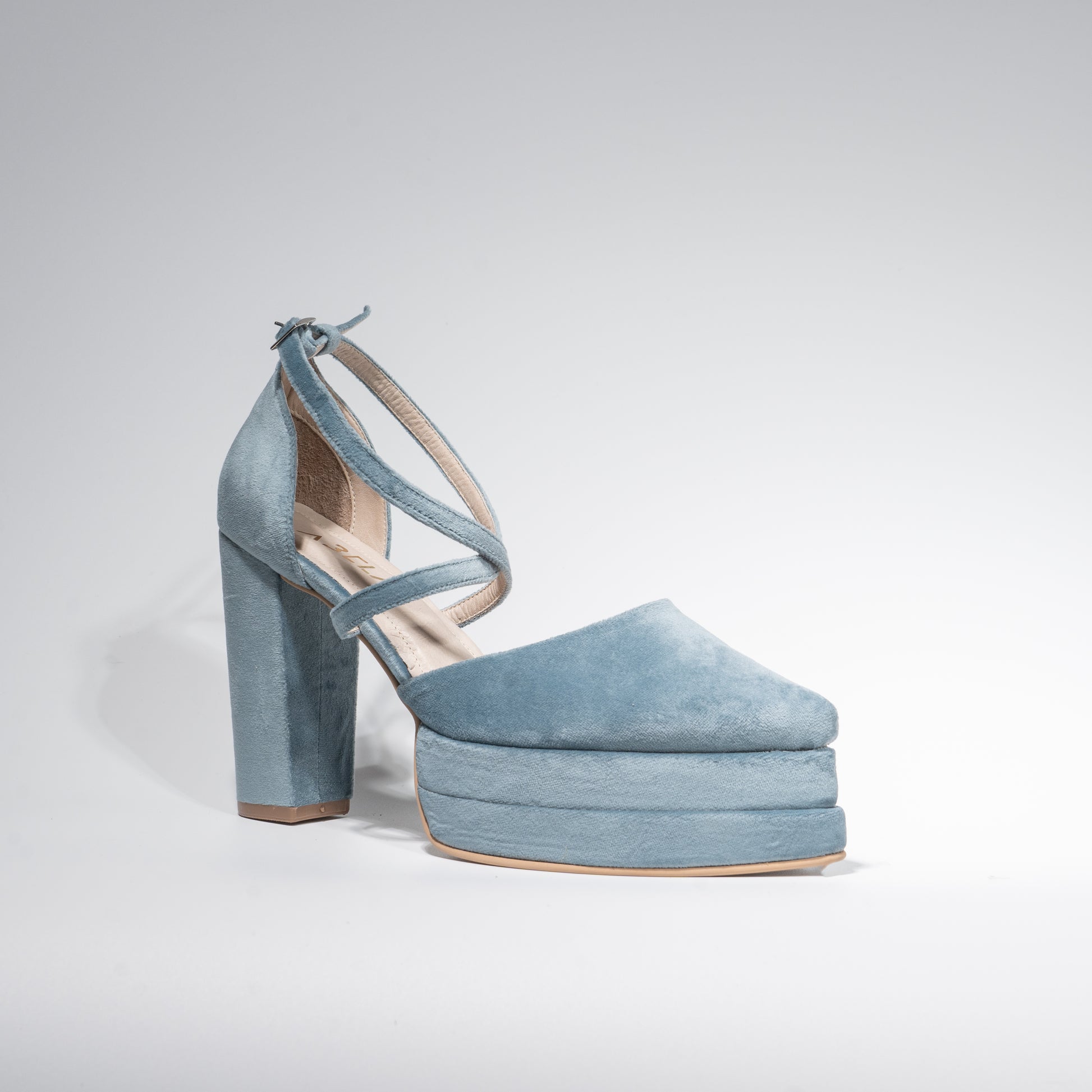 Nuestros tacones Ensueño están elaborados en terciopelo azul cuentan con una doble plataforma y correas al tobillo cruzadas para adornar y brindar apoyo. Su punta tipo stiletto y su tacón super cuadrado de 11.5cm le da el confort necesario para bailar toda la noche.