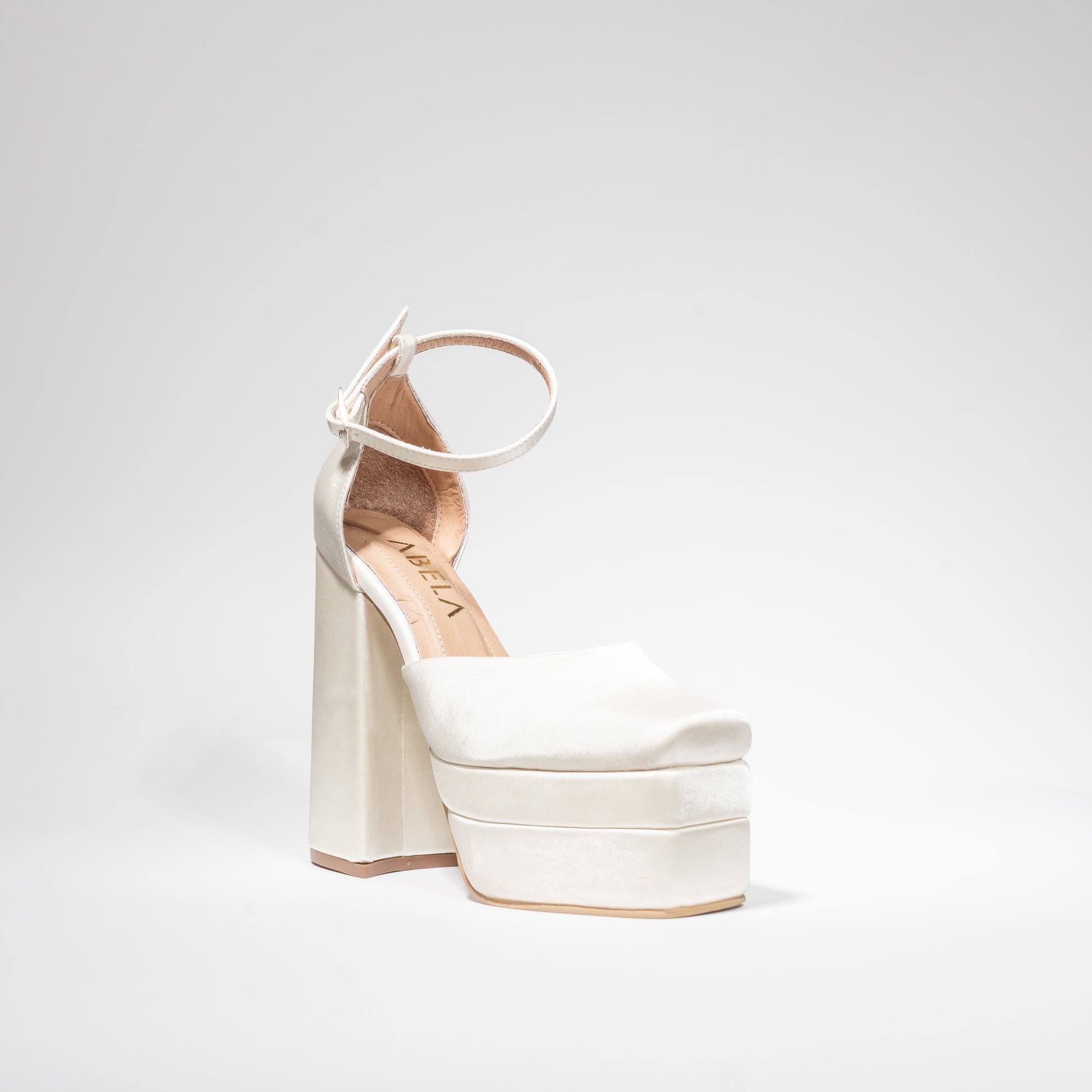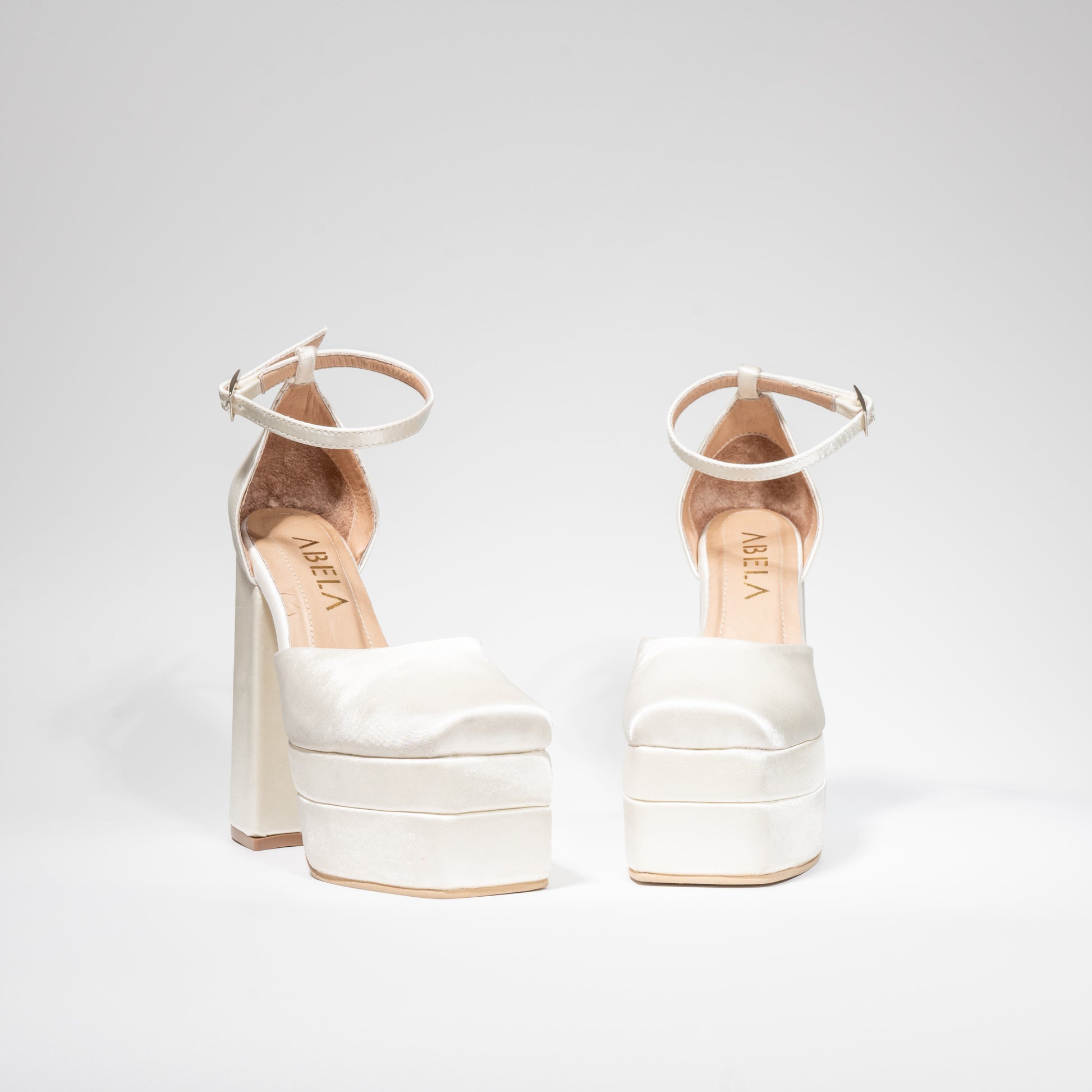 Nuestros tacones Ensueño de punta cuadrada están elaborados en rasso blanco perla, cuentan con una doble plataforma y correa al tobillo para adornar su tacón super cuadrado. El tacón mide por detrás 14cm y la plataforma tiene un total de 5cm.