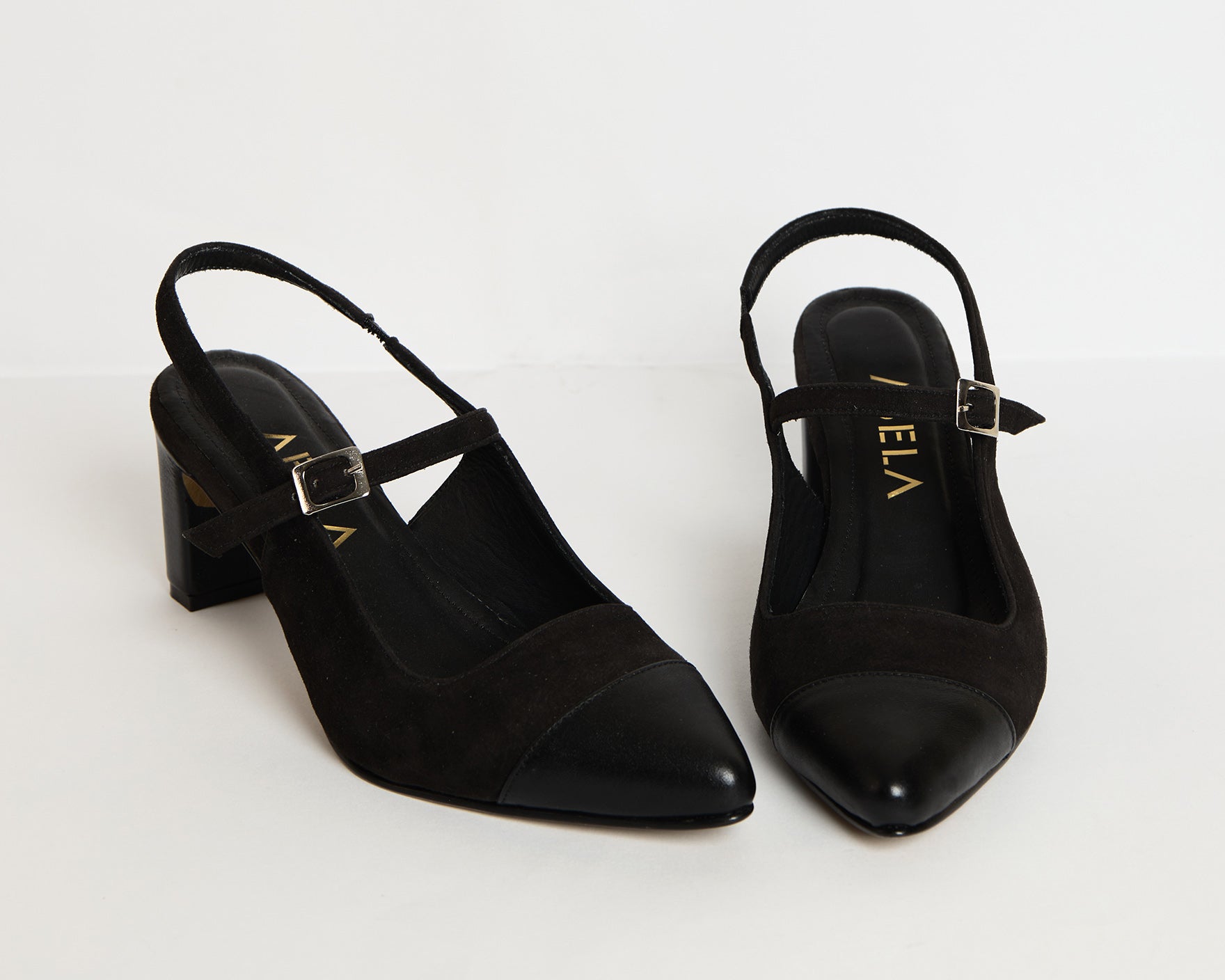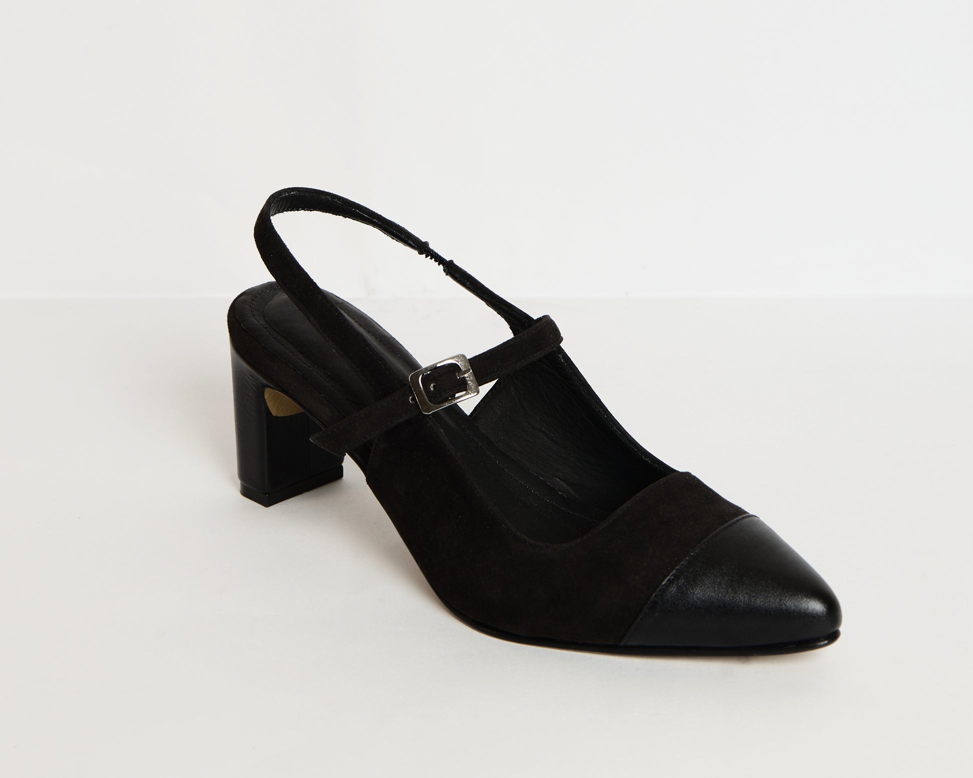 Tacones elaborados en gamuza negra y cuero negro, destalonados, con tacón cuadrado de 5.5cm de altura.