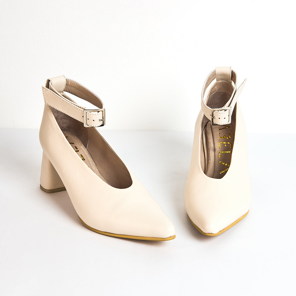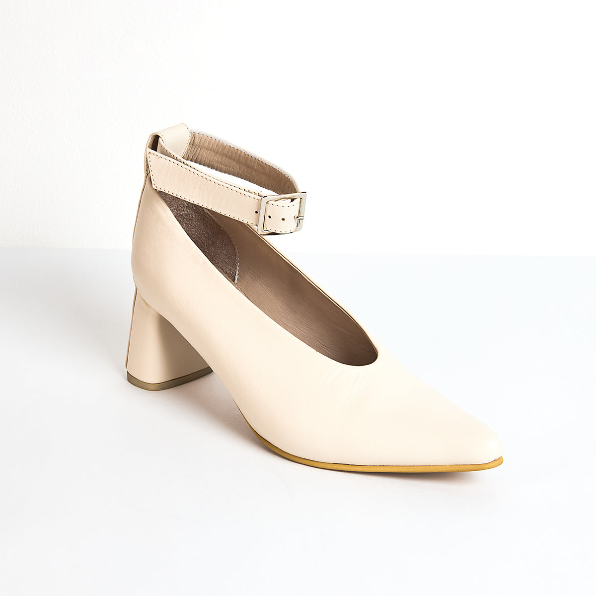Tacones de punta puntuda, elaborados en cuero liso marfil, con tacón paleta ancho que mide por detrás 6.5cm y con trabilla de 2cm al tobillo