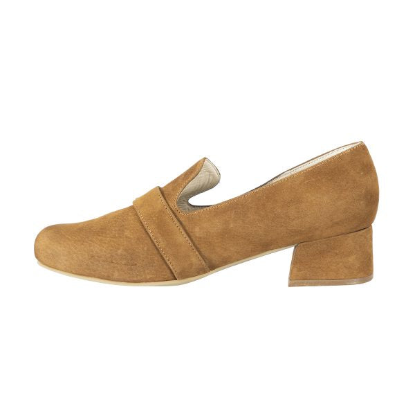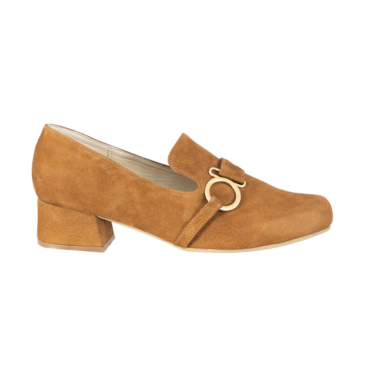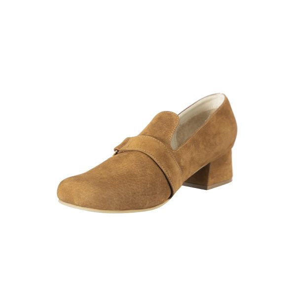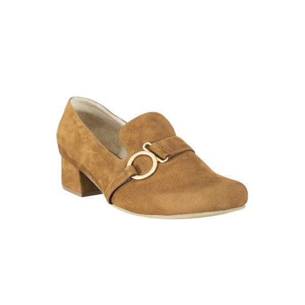 Tacones tipo loafer, elaborados en cuerpo tipo nobuk color miel, tacón súper cuadrado de 3.5cm, con un herraje en forma circular que representa la forma de la tierra.