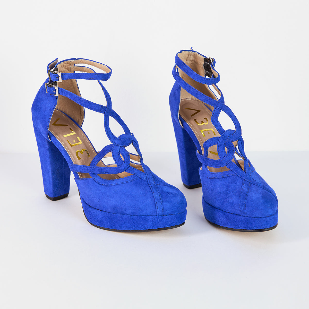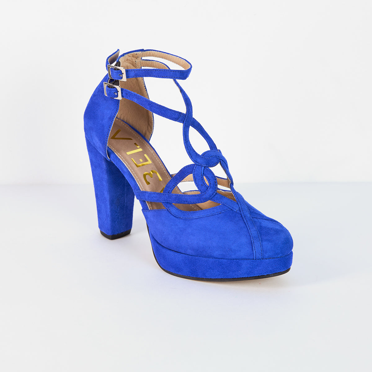 Tacones elaborados en gamuza azul rey. Un diseño que habla por si solo gracias a los arabescos en forma de ochos que adornan el pie y estilizan tus piernas con su punta almendrada.