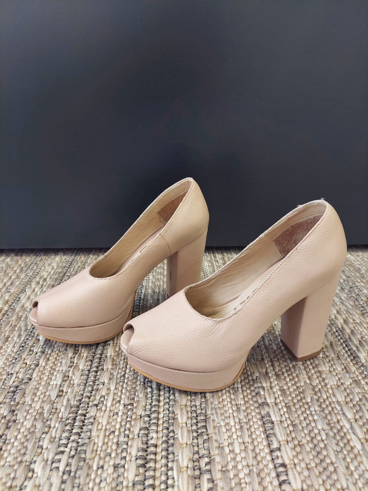 Heels made of ivory leather, with a 2 cm external platform and a 1 cm high square heel (including the platform).