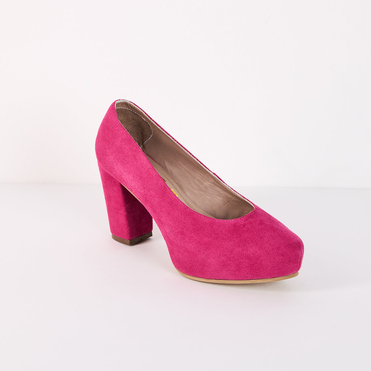 Tacones con punta almendrada, plataforma de 2cm escondida y tacón cuadrado medido por detrás de 9cm de altura. Elaborados en gamuza fucsia.