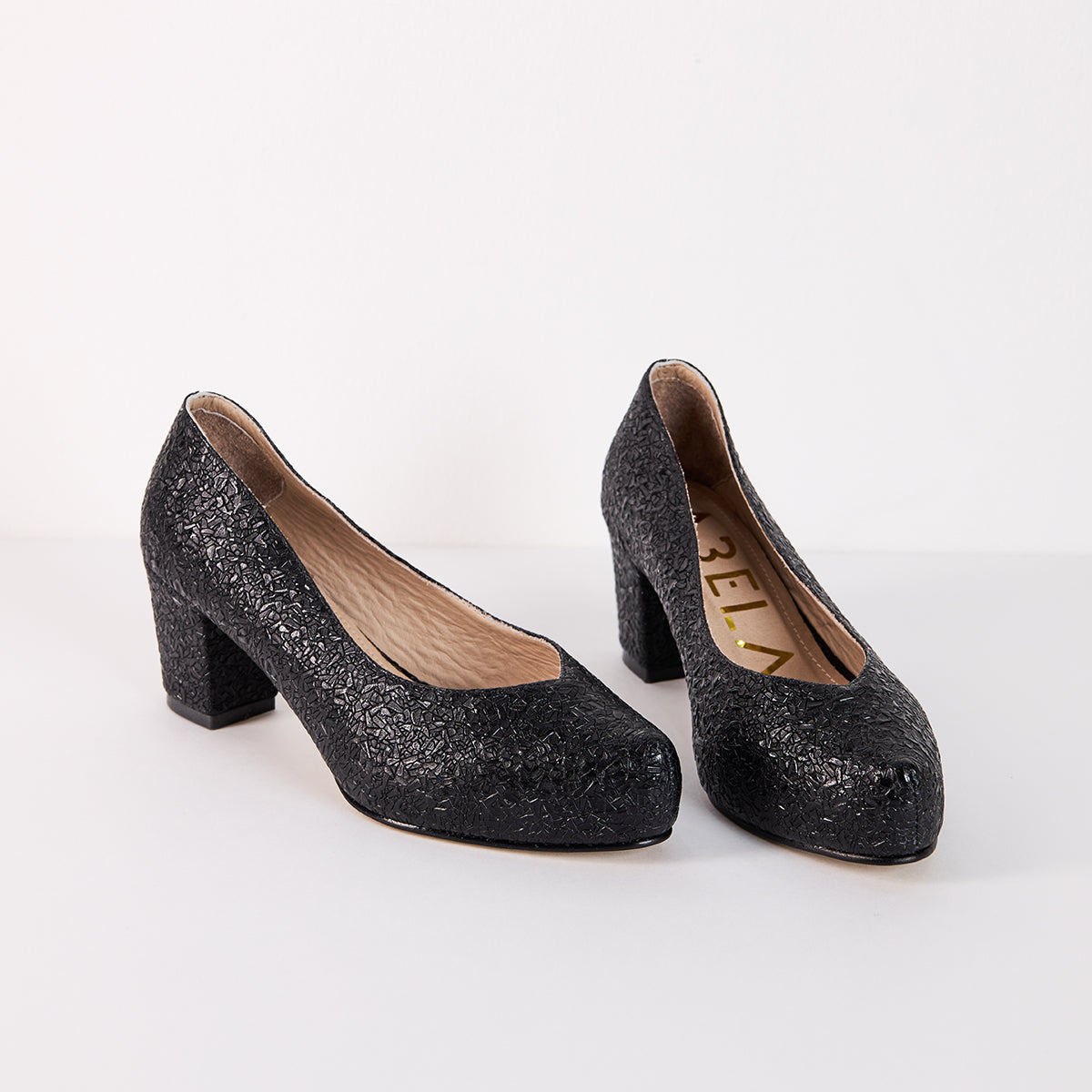 Tacones tipo zapatilla de punta almendrada con corte clásico, capellada en V, plataforma interna de 1cm y tacón cuadrado medido por detrás de 6cm. Elaborados en cuero negro con textura tipo topacio.