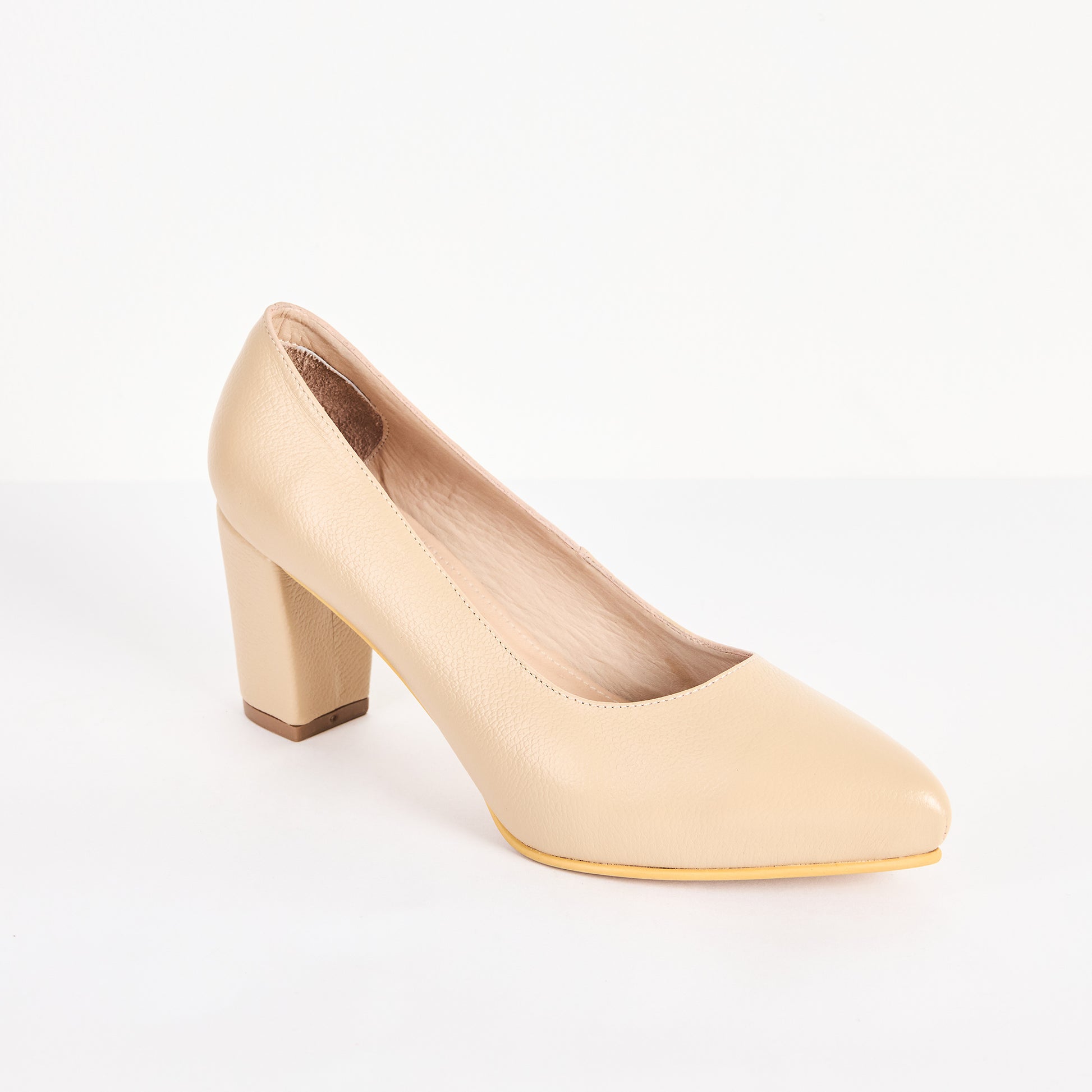 Tacones elaborados en cuero almendra, con plataforma interna de acm y tacón cuadrado de altura 8cm (incluida la plataforma).