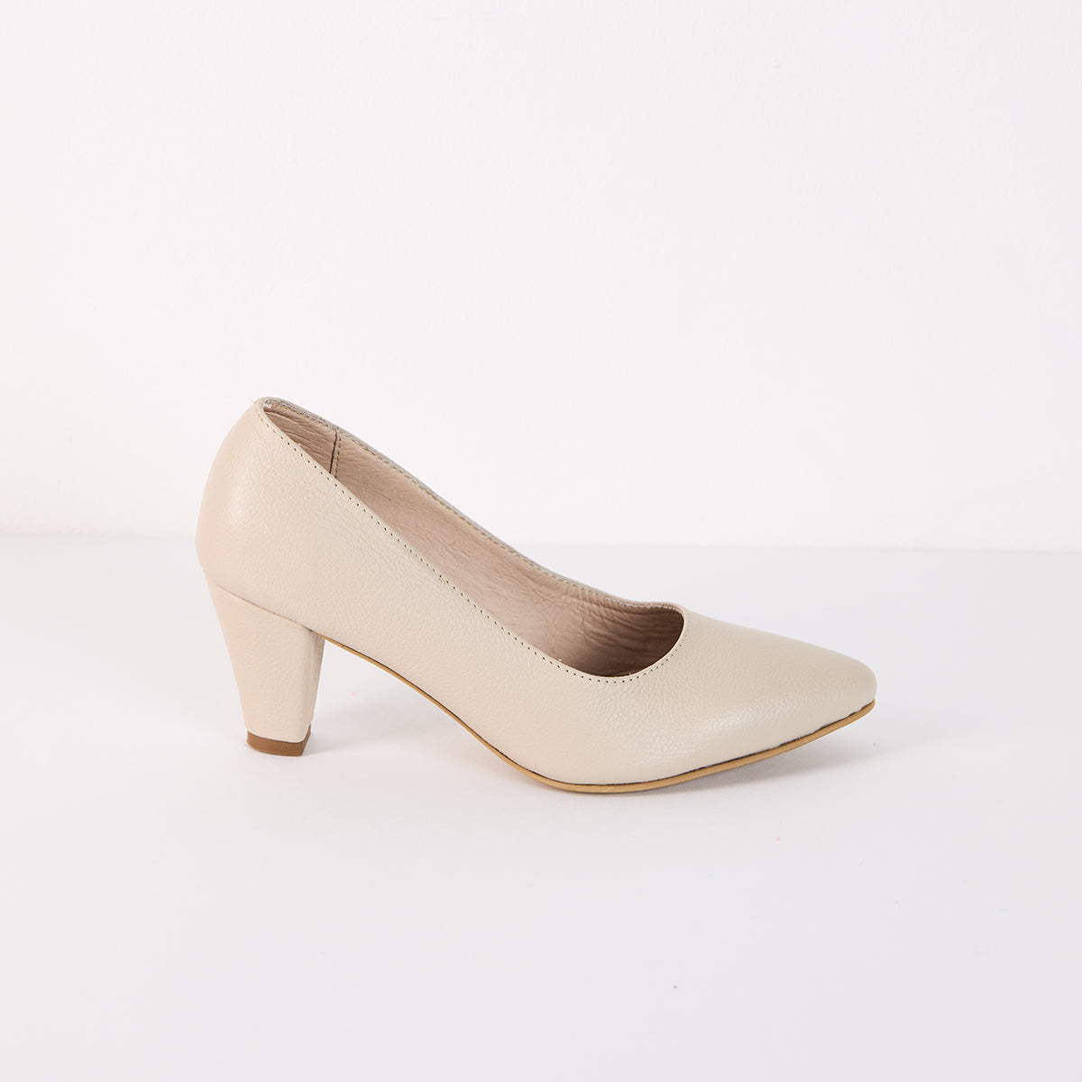 Tacones tipo stiletto, con punta puntuda, altura 5.5cm, con tacón semicadrado y en cuero color talco.