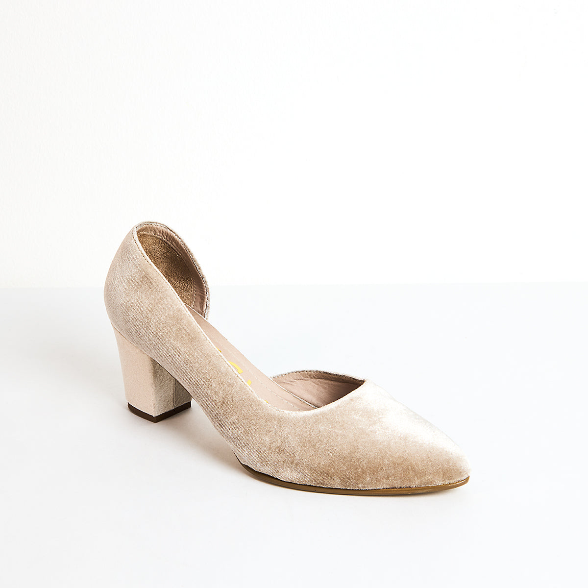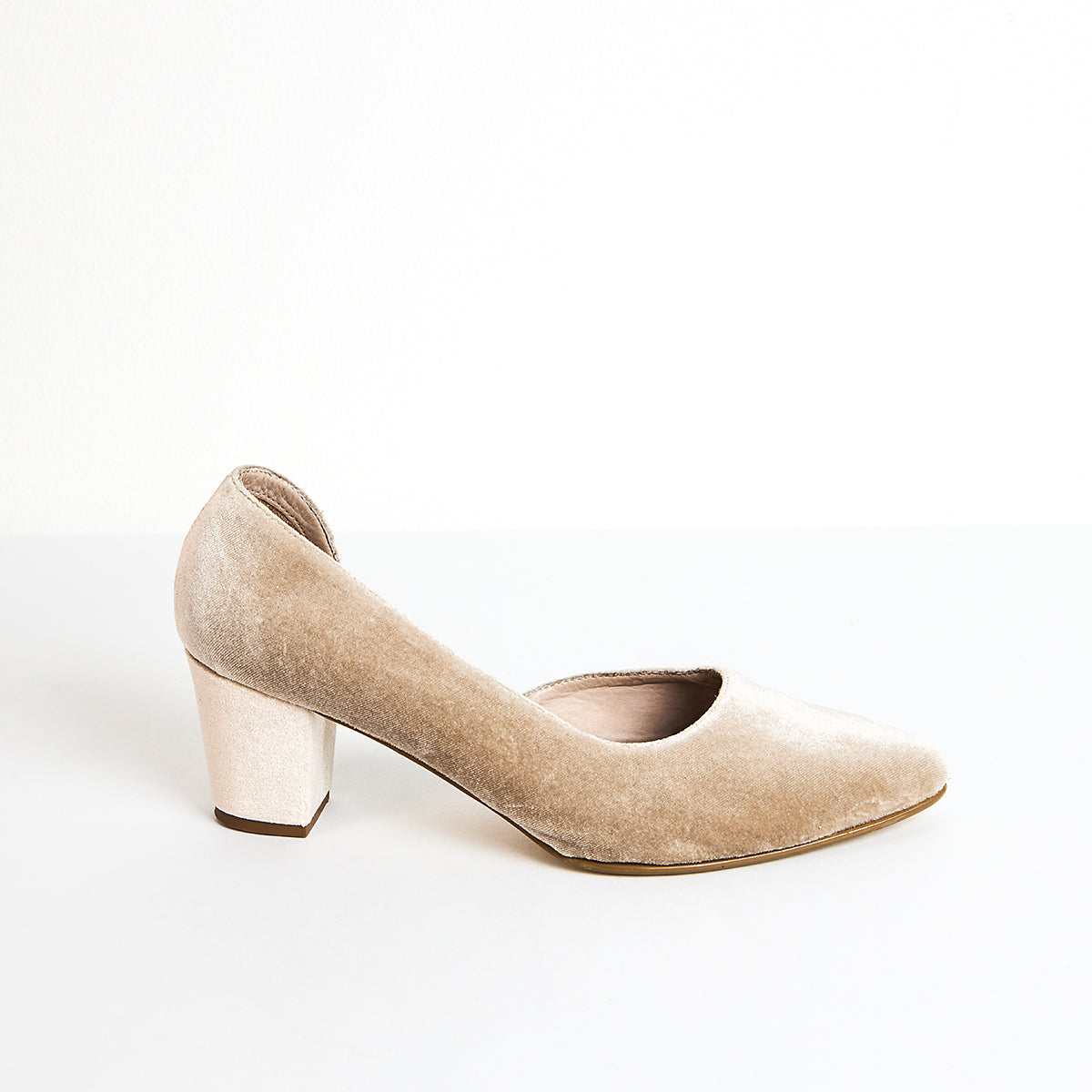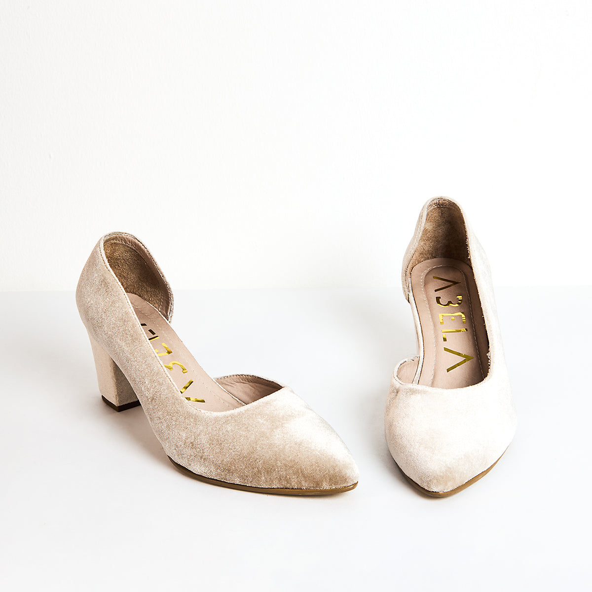 Cross-cut sandals with crossed straps for support. Made of nude leather and semi-square heel.