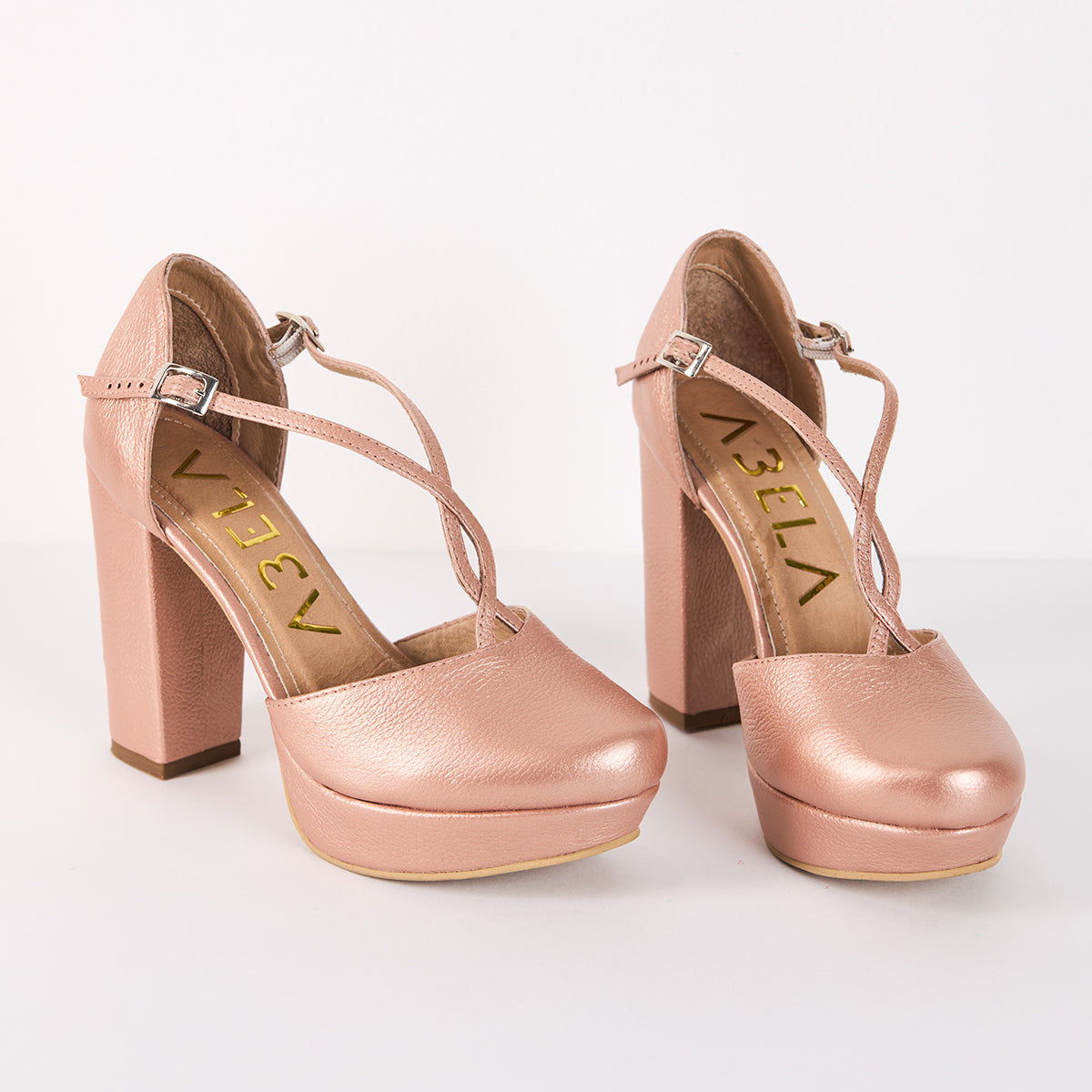 Tacones de punta redonda, con trabilla en T tejida de forma intercalada y doble ajuste en el empeine. Elaborados en cuero oro rosa, con 2cm de plataforma visible, tacón cuadrado y altura del tacón medida por detrás de 11cm.