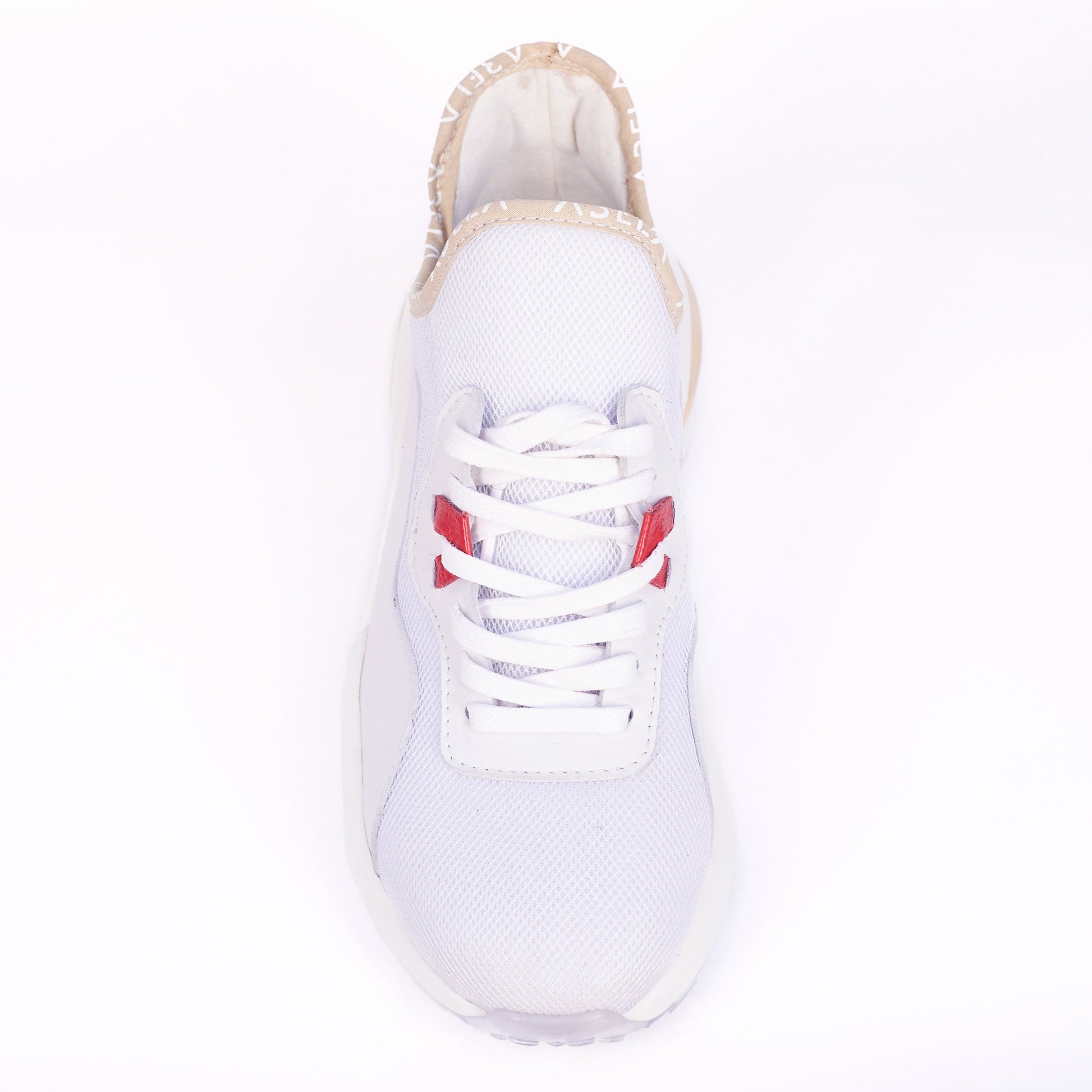 Tenis elaborados con textil blanco tipo malla y cuero rojo.