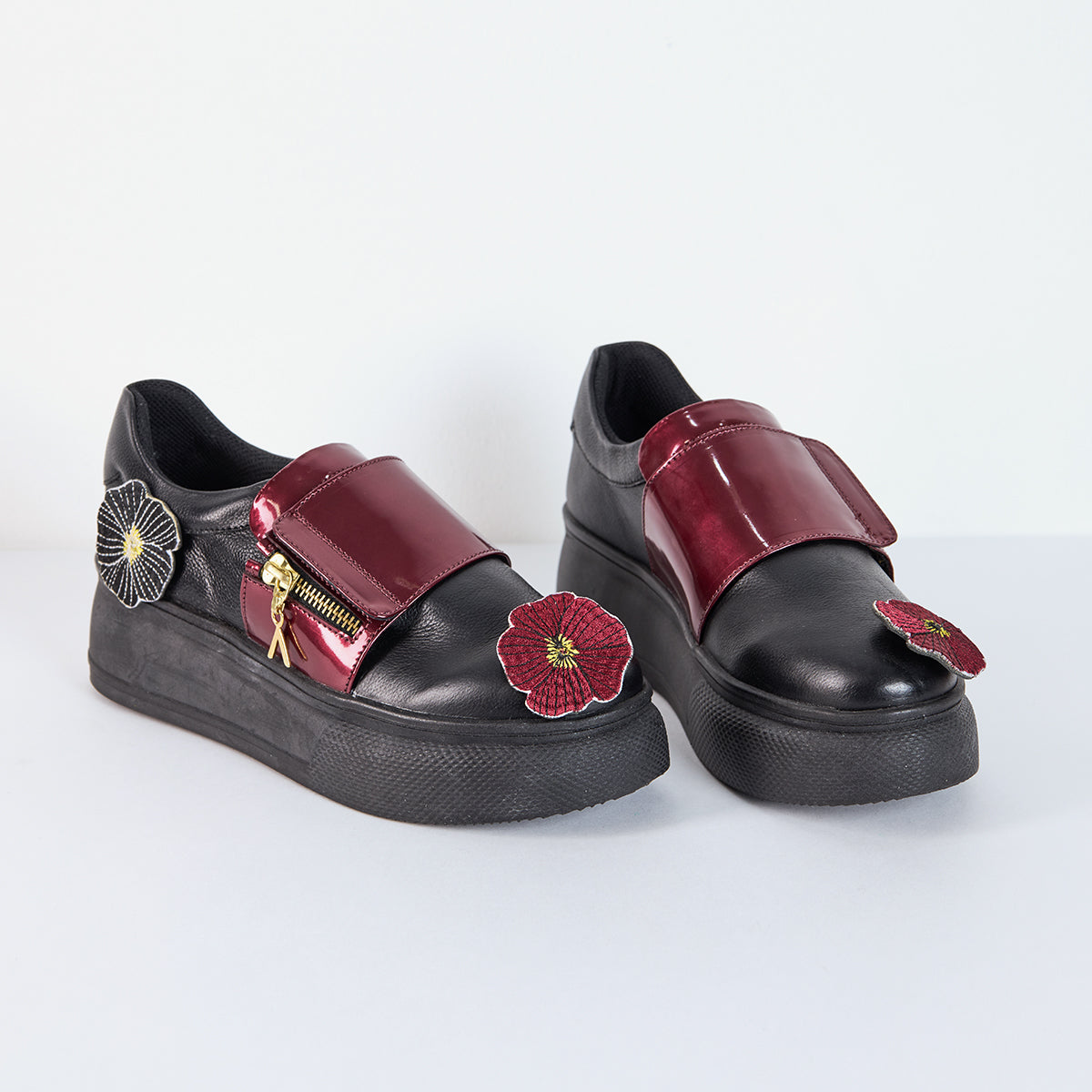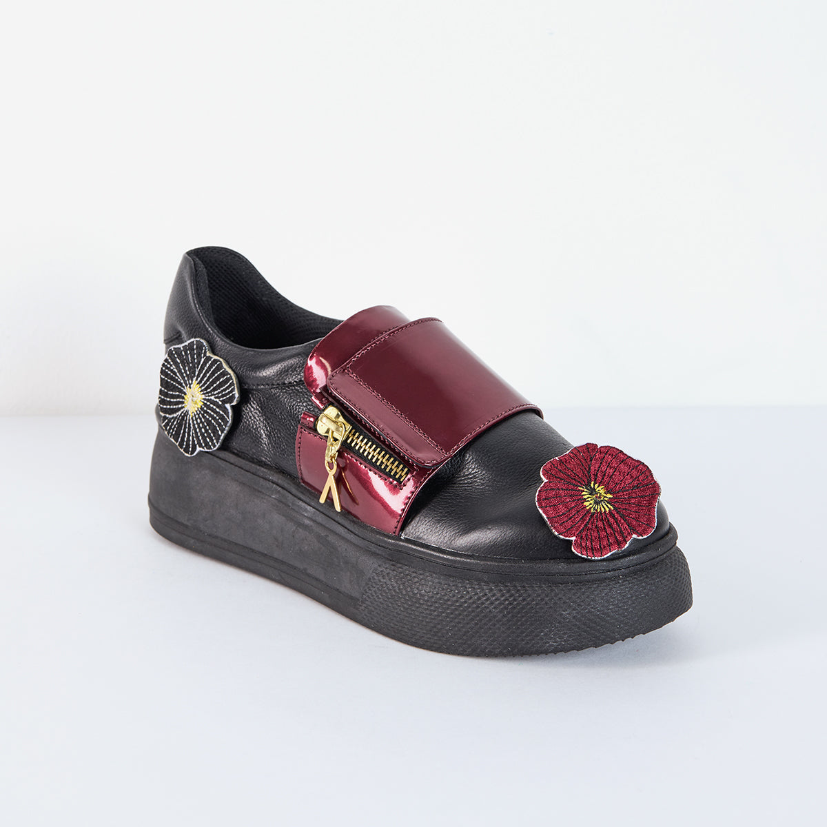 De nuestra colección Autarquía Floreciente, nacieron estos tennis divertidos en color blanco que toman vida gracias a las flores intercambiables en negro y vinotinto. Con una plataforma de 3cm y amarre con elásico y cremallera brindan comodidad y alegría a tus looks de verano.