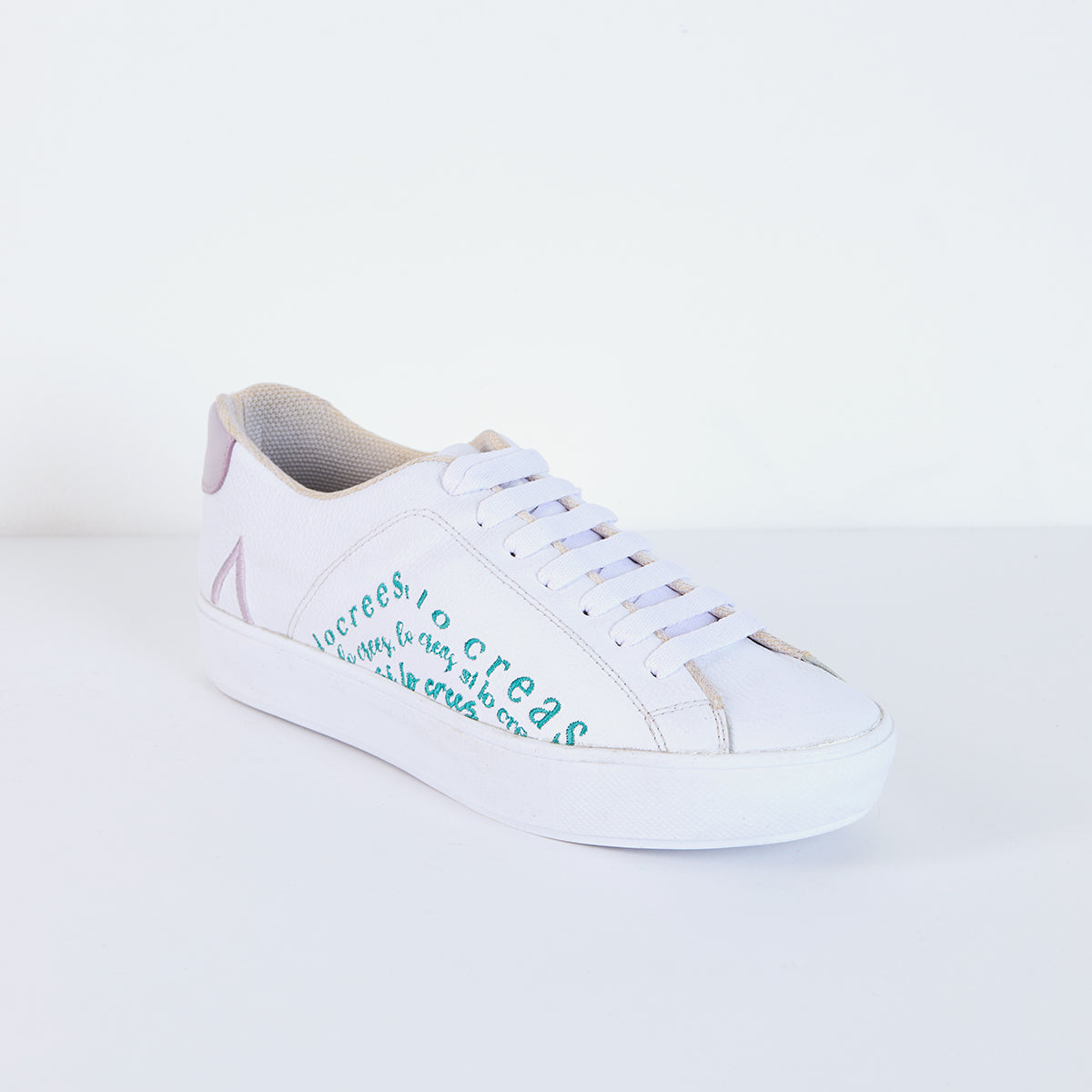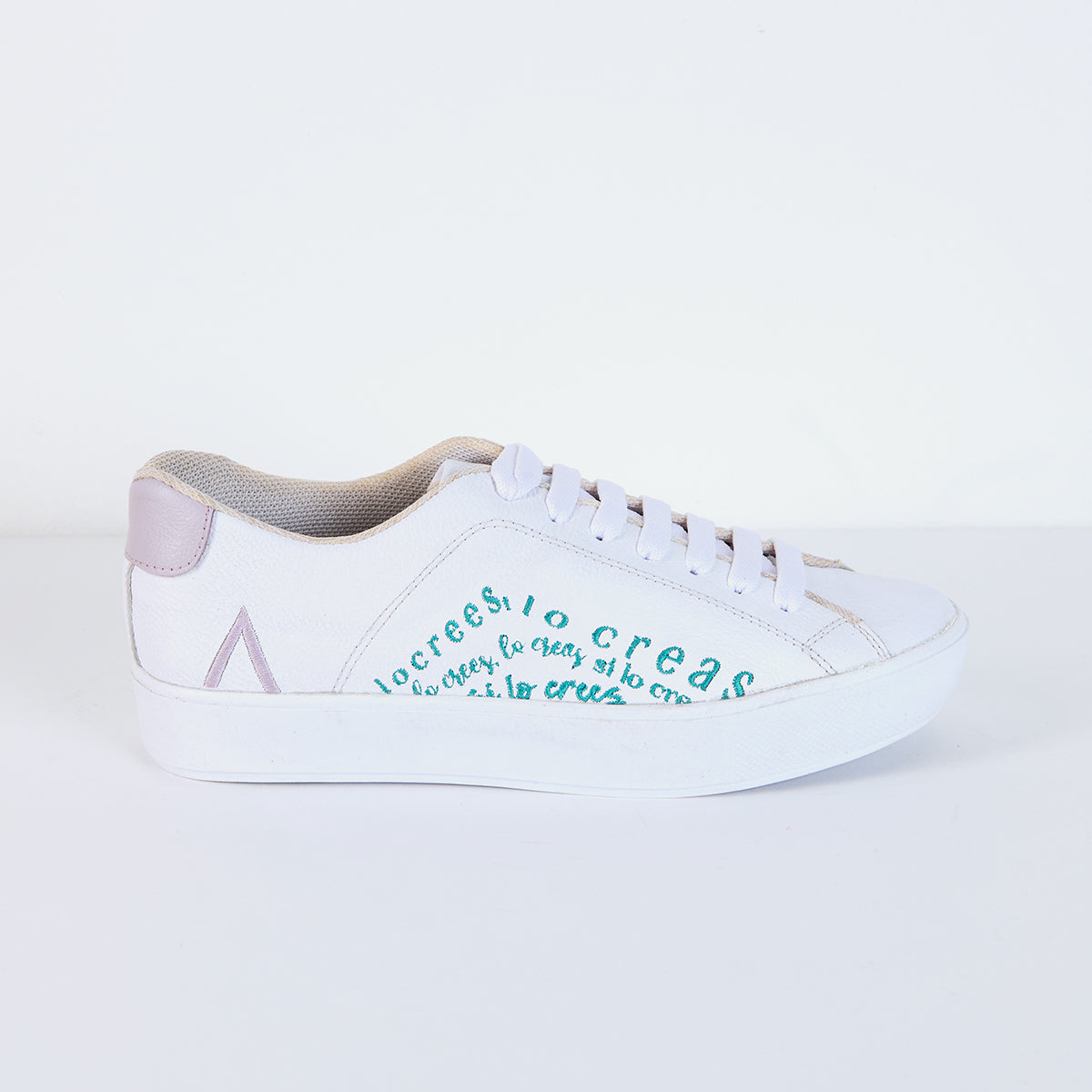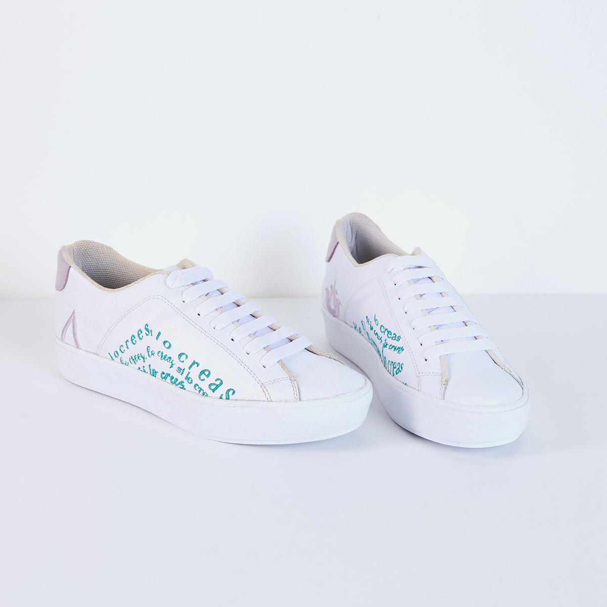 Classic tennis shoes, in leather, with hand embroidery on the inside and outside. The embroidery is found asymmetrically representing the logo of the two brands in collaboration.