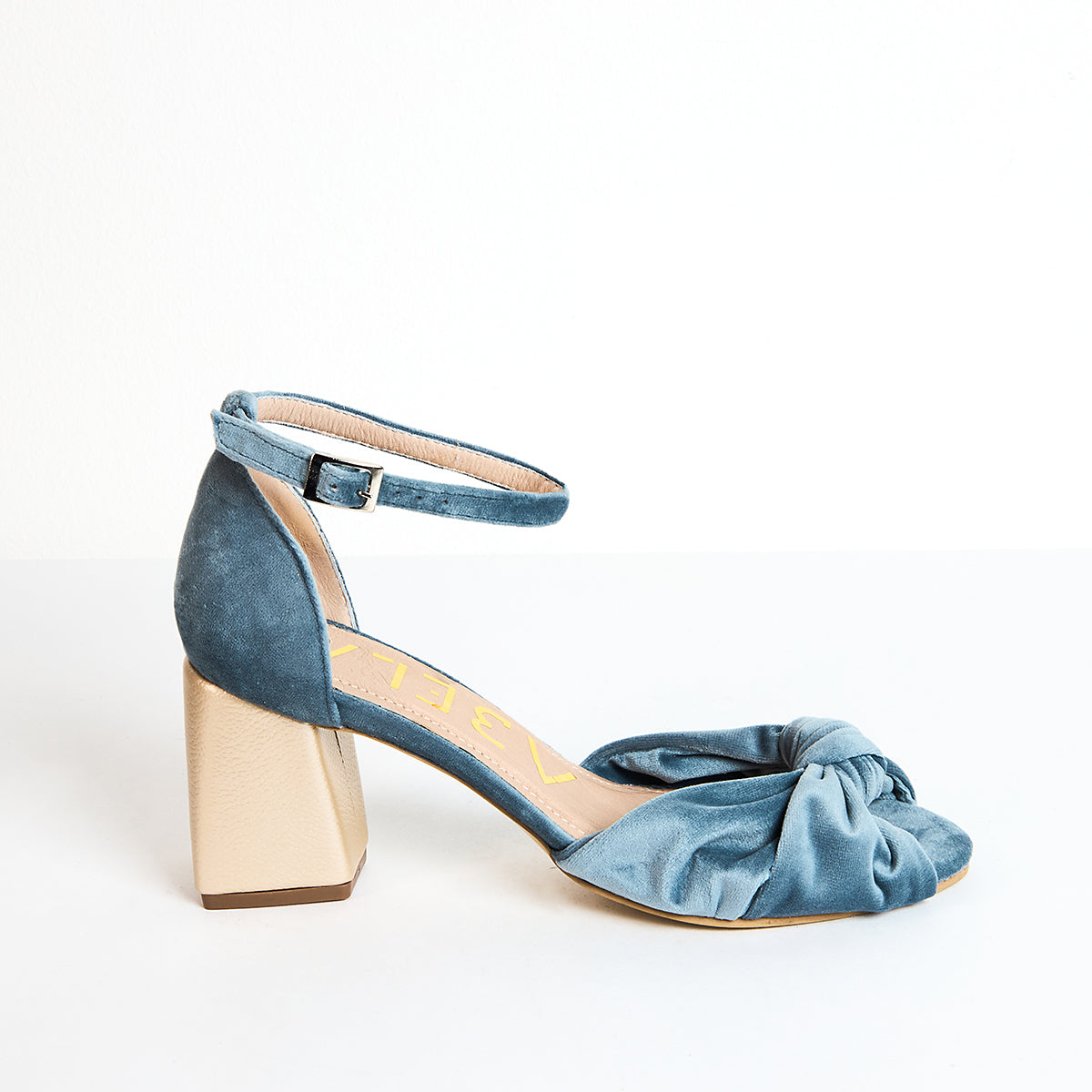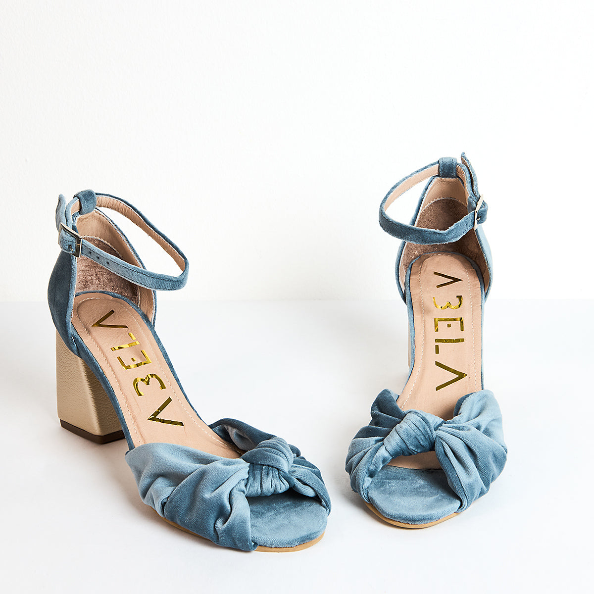 Sandalias elaboradas en terciopelo azul, con tacón trapezoide medida por detrás de 5.5, sin plataforma y correa para ajustar en el tobillo.