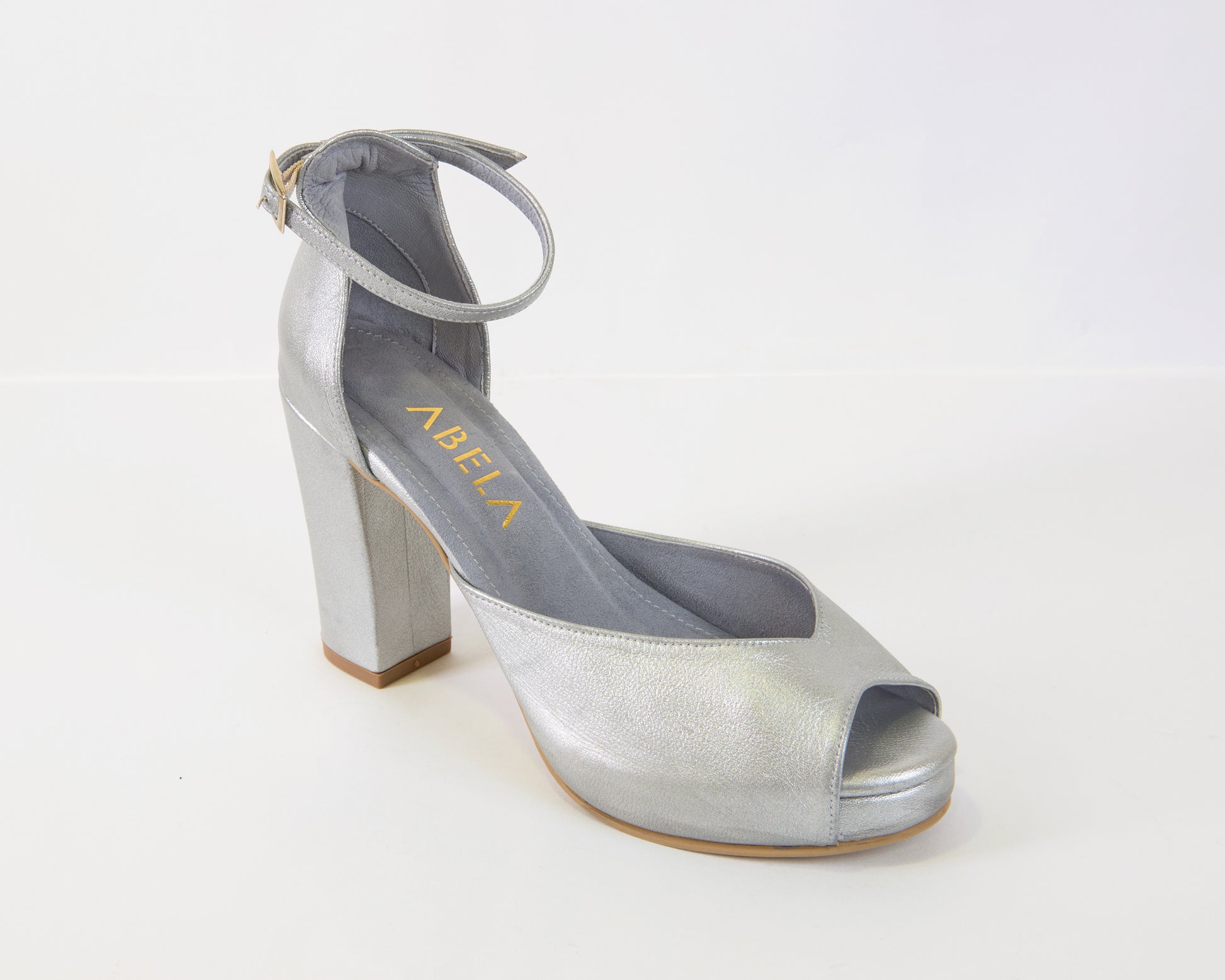 Sandalias elaboradas en cuero tipo folia plata, con correa al tobillo. Cuentan con tacón cuadrado de 10cm y plataforma interna de 1cm.